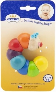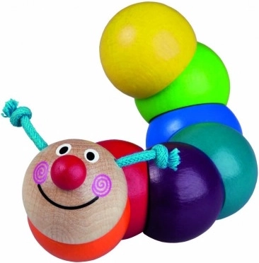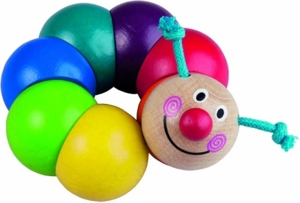 Omidă colorată din lemn, din mărgele înșirate pe un elastic, susține dezvoltarea motricității fine încă de la 6 luni. Este netoxică, respectă normele UE și, datorită lungimii compacte de 13 cm, se ține ușor chiar și în mânuțe mici.