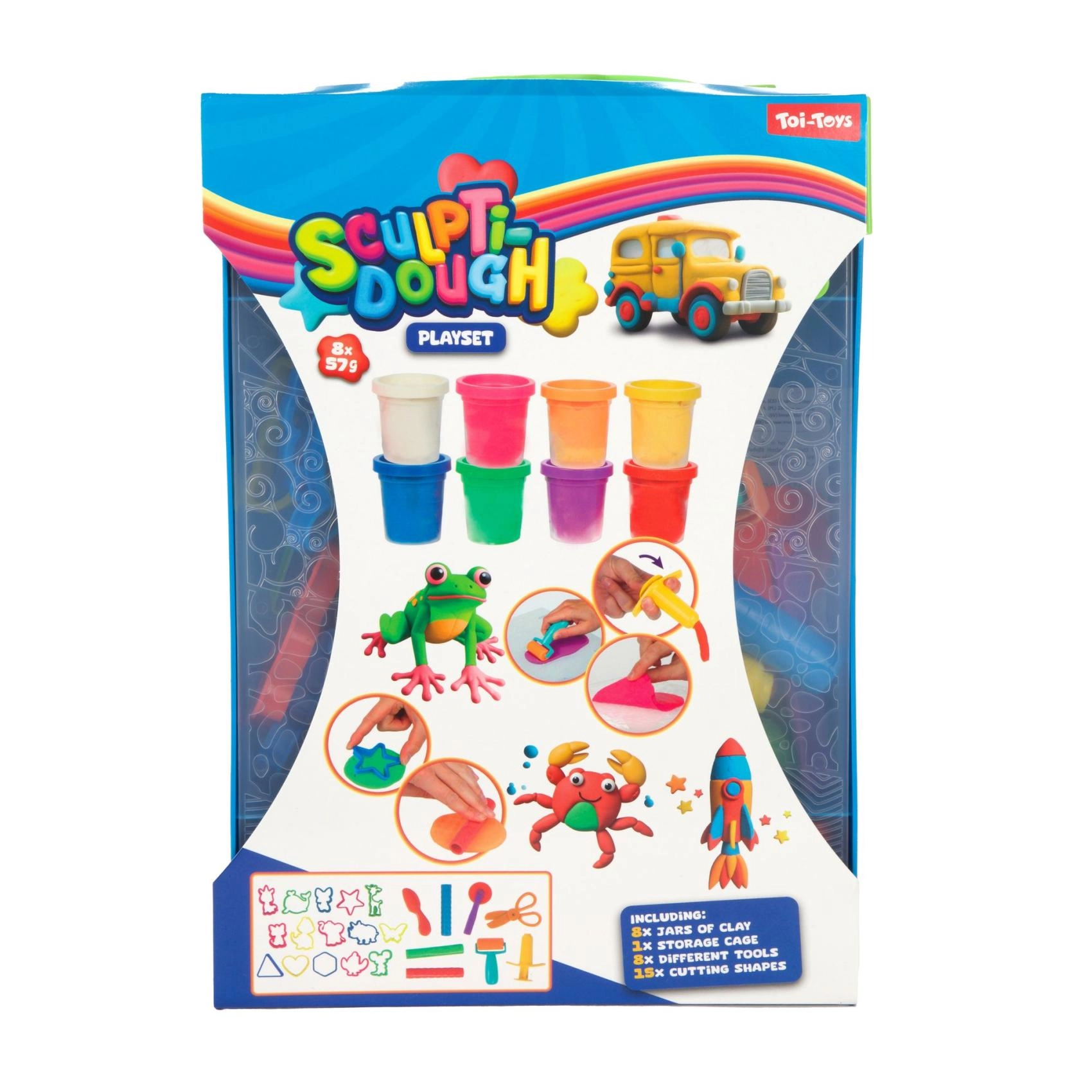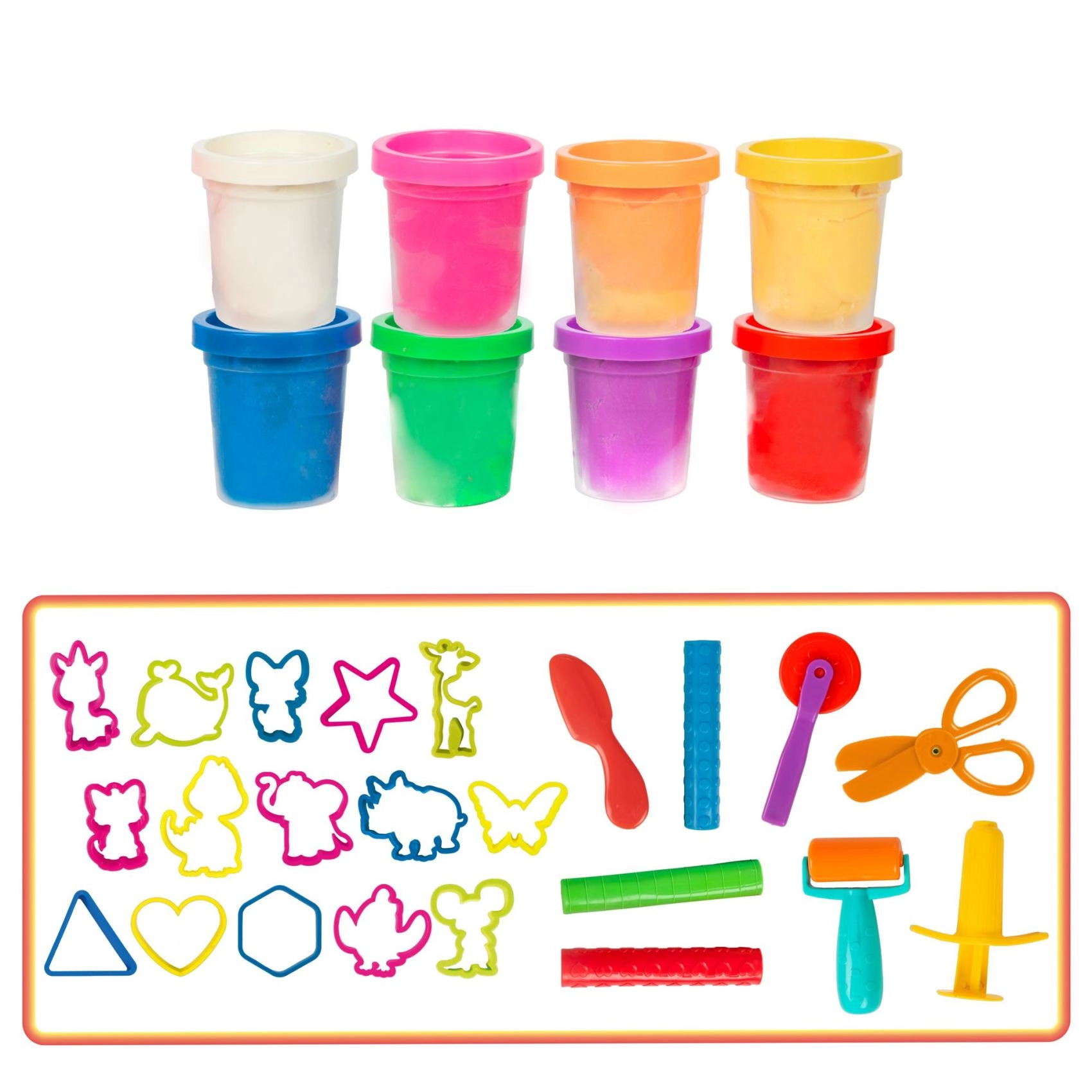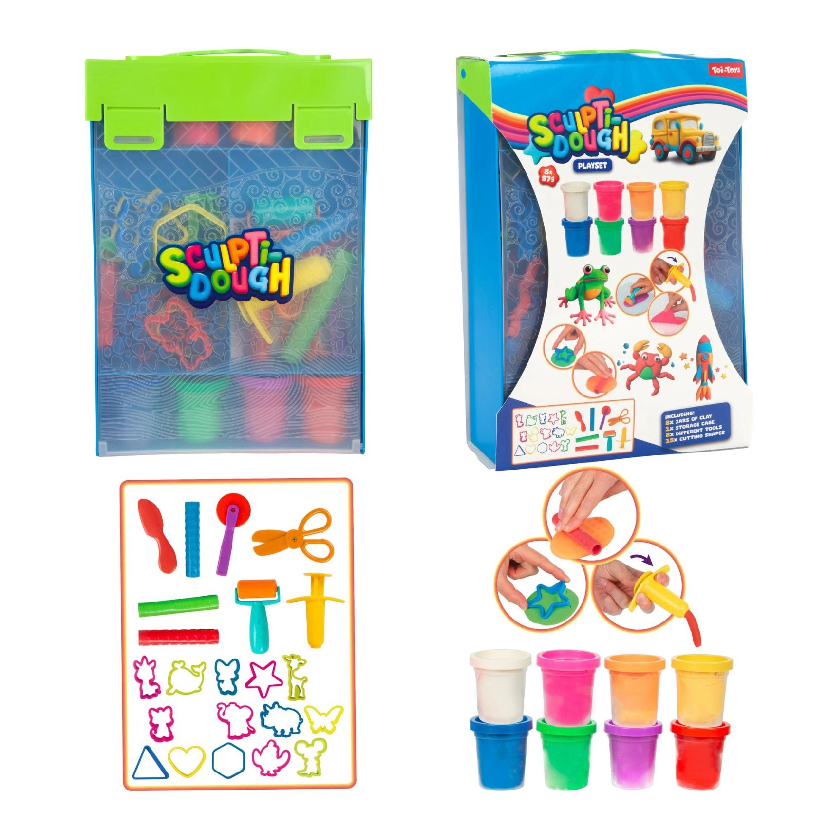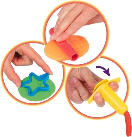 Cele opt borcănașe de plastilină sunt completate de role, cuțitașe, foarfece și forme – copiii pot începe să creeze imediat, fără achiziții suplimentare.