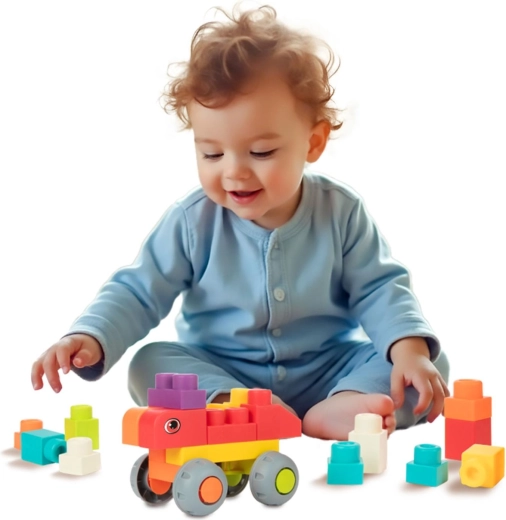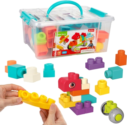Acest set moale de construcție este prima alegere ideală pentru micii constructori. Datorită marginilor rotunjite și pieselor flexibile, cuburile sunt sigure pentru mânuțele mici și, în același timp, suficient de ferme pentru construcții stabile. Setul conține 48 de elemente colorate, inclusiv piese cu imprimeu de ochișori și roți pentru vehicule simple.