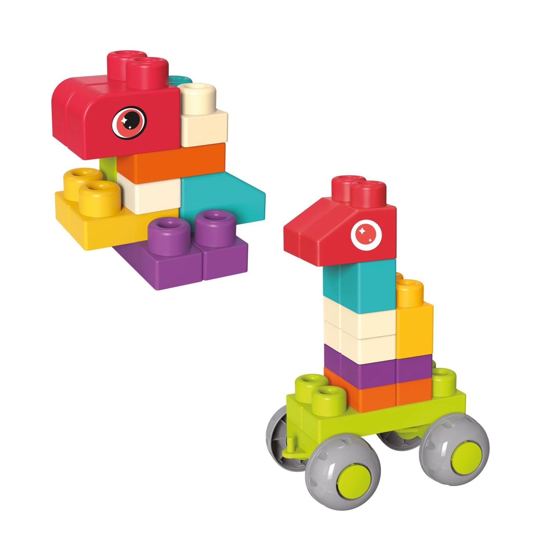 Setul include piese și un șasiu cu roți pentru animăluțe și vehicule simple, mobile. Ideal pentru joacă dinamică și stimularea imaginației.