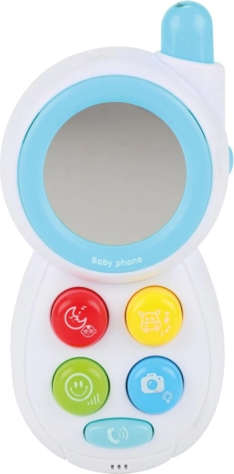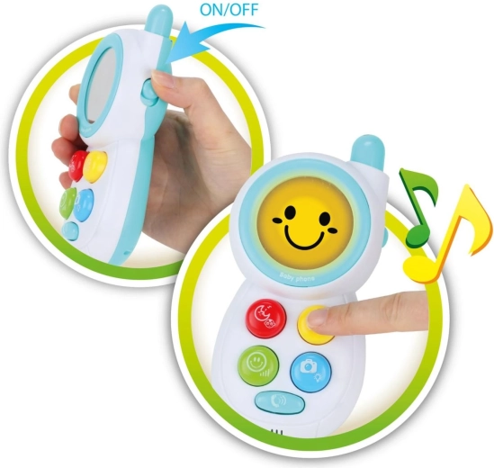 Acest telefon mobil adorabil pentru copii este o jucărie ideală pentru dezvoltarea simțurilor și curiozității bebelușilor și a copiilor mici. Butoanele colorate activează efecte sonore și melodii care stimulează auzul și atenția, în timp ce efectele luminoase susțin percepția vizuală. Pe partea din față se află o oglindă mare și sigură, datorită căreia copiii își descoperă reflexia și își dezvoltă conștientizarea de sine.