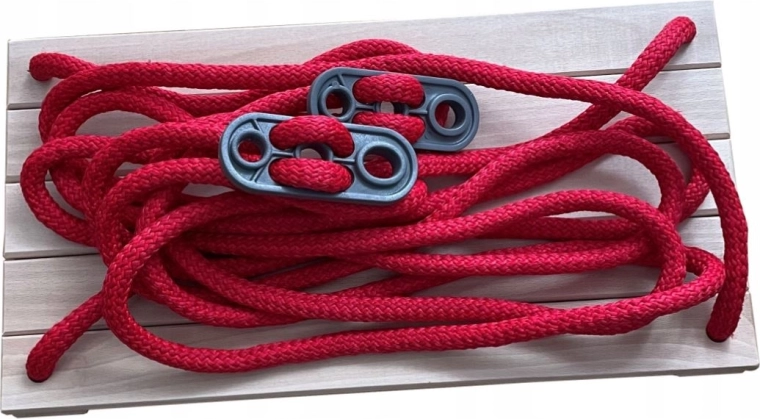Patru corzi roșii rezistente, cu inele metalice și cârlige netede, sunt proiectate pentru durabilitate și utilizare în siguranță.