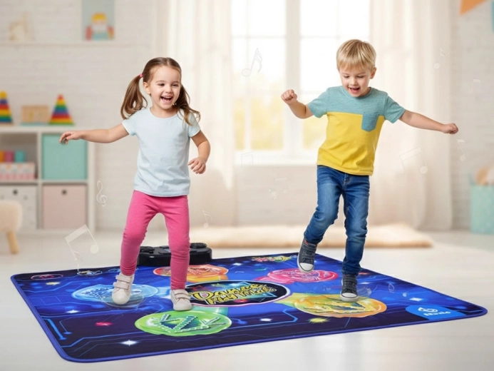 Pornește distracția acasă sau la petrecere cu covorașul de dans pentru copii, care îmbină mișcarea, muzica și efectele luminoase. Câmpuri tactile interactive, iluminare LED, mai multe moduri de joc și 9 melodii integrate îi încurajează pe cei mici să se miște, dezvoltându-le ritmul și coordonarea. Stratul inferior antiderapant asigură stabilitate și siguranță în timpul dansului, iar după joacă covorașul se pliază ușor pentru depozitare.
