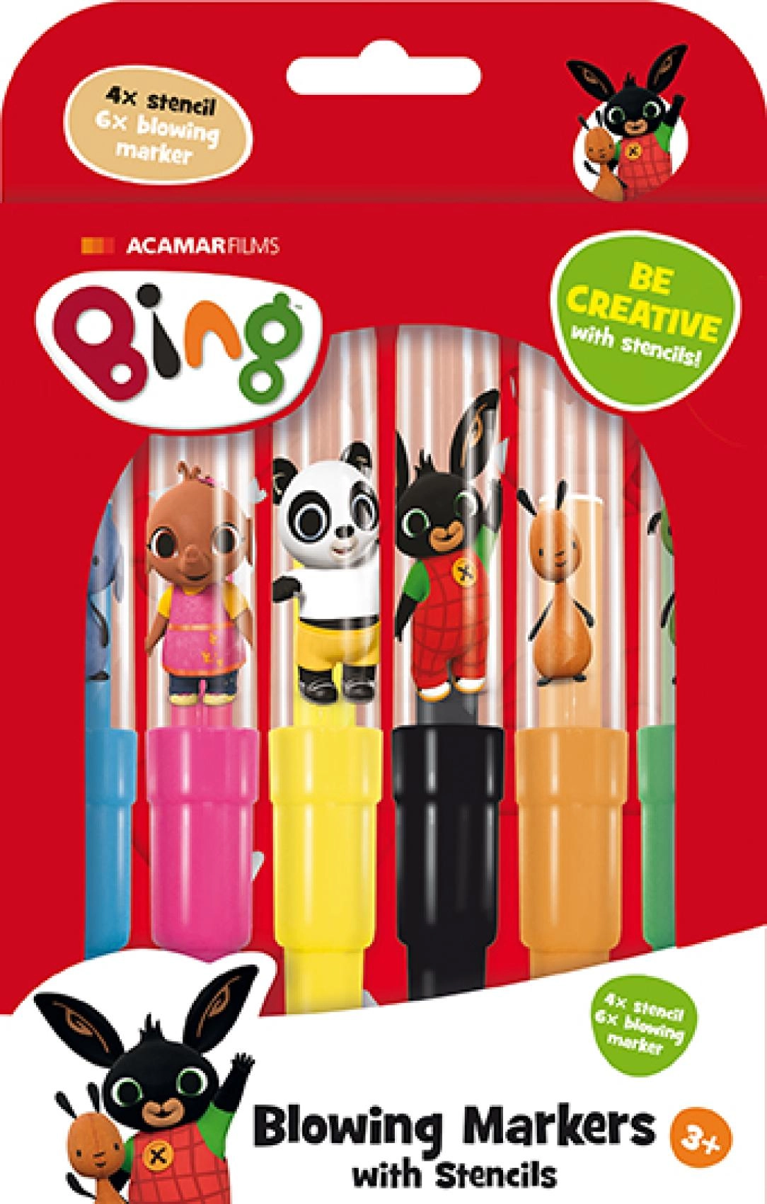 Descoperă creația distractivă cu carioci cu suflat și șabloane cu motive IEPURAȘUL BING. Setul conține 6 carioci cu suflat colorate și 4 șabloane din hârtie, cu ajutorul cărora copiii creează cu ușurință desene spray spectaculoase. Ideal pentru dezvoltarea creativității, motricității fine și imaginației.