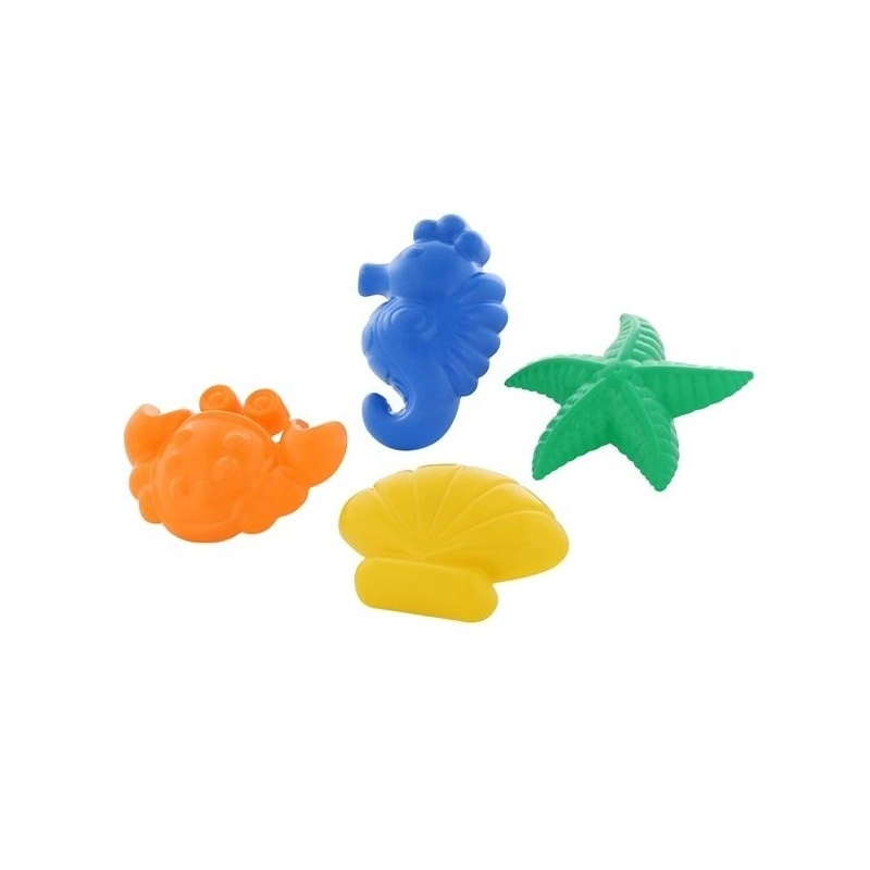 Set distractiv cu 4 forme din plastic pentru nisip în forme de crab, stea de mare, scoică și căluț de mare, care transformă orice groapă cu nisip sau plajă într-un atelier creativ. Copiii creează cu ușurință amprente frumoase, își dezvoltă motricitatea fină, imaginația și se bucură de multă distracție în aer liber.