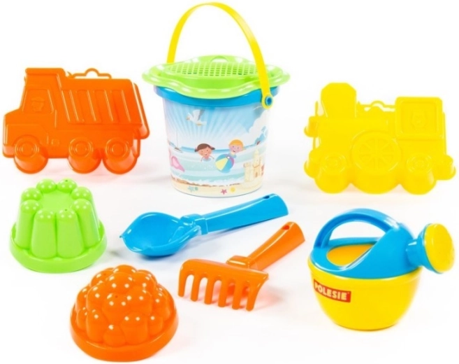 Practic set pentru nisip cu găletușă mică și sită în formă de floare, conține lopățică, greblă, stropitoare și 4 forme (de ex. mașinuță și locomotivă). Grozav pentru locul de joacă cu nisip și plajă, stimulează imaginația și dezvoltarea motricității fine. Livrat în variante de culori diferite, aleator, în funcție de disponibilitate. Prețul este pentru un set.