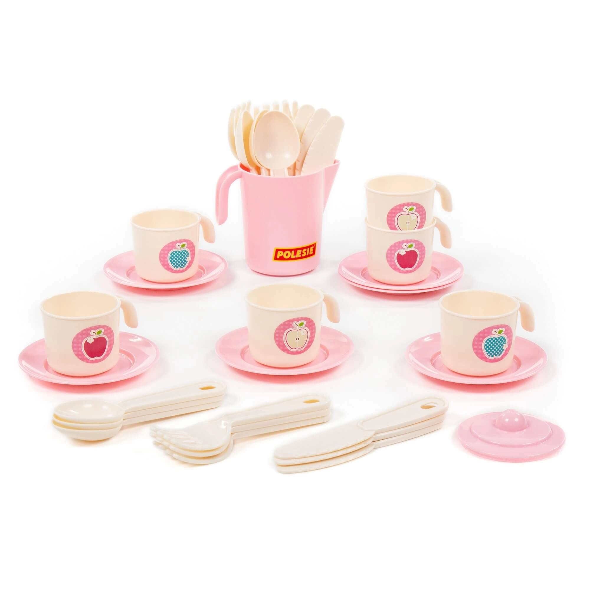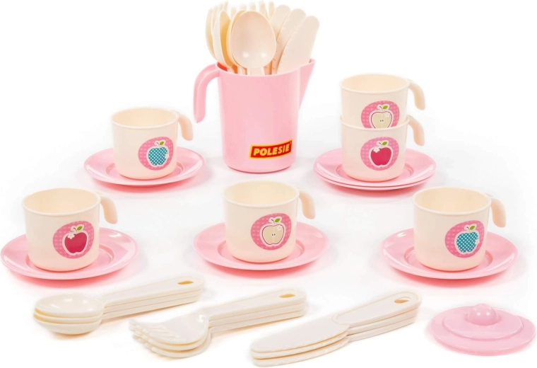 Setul de 32 de piese include cești cu farfuriuțe, farfurii, tacâmuri și ceainic – copiii au tot ce le trebuie pentru a servi băuturi și bunătăți.