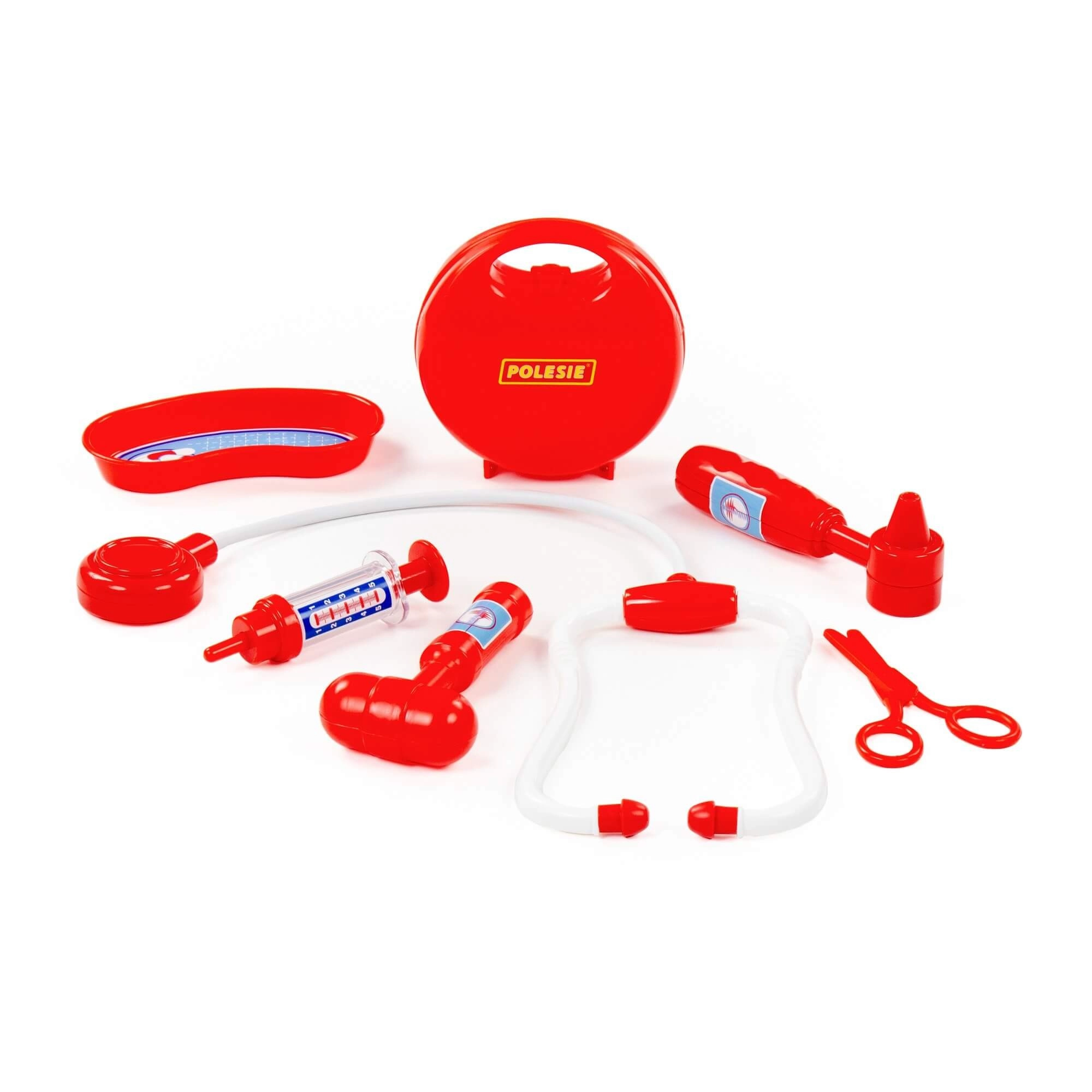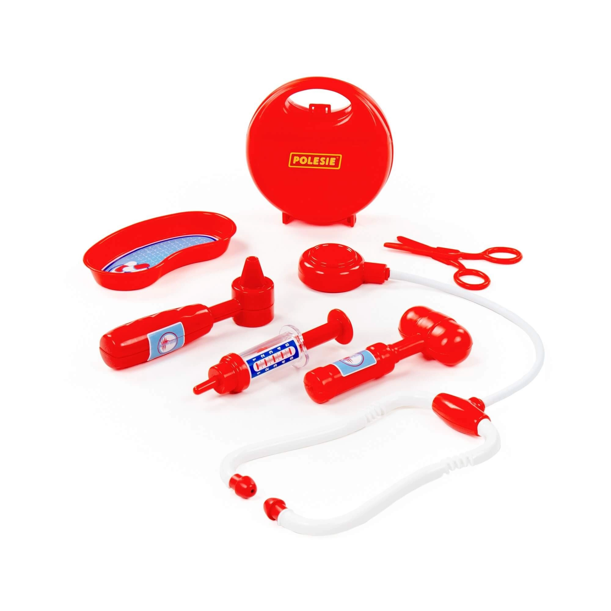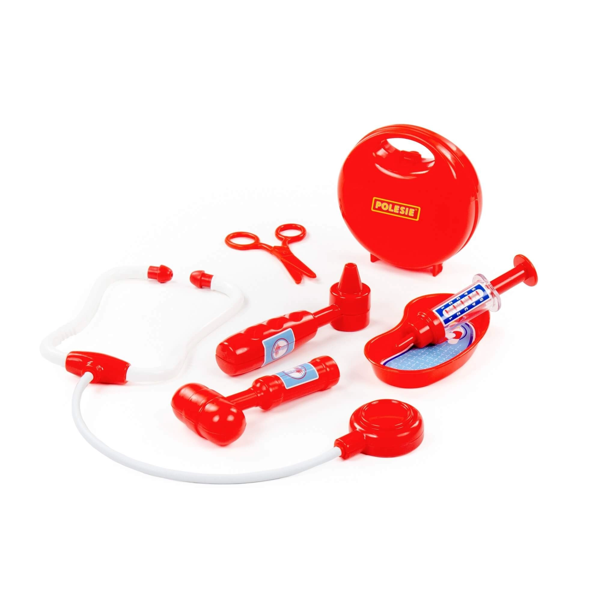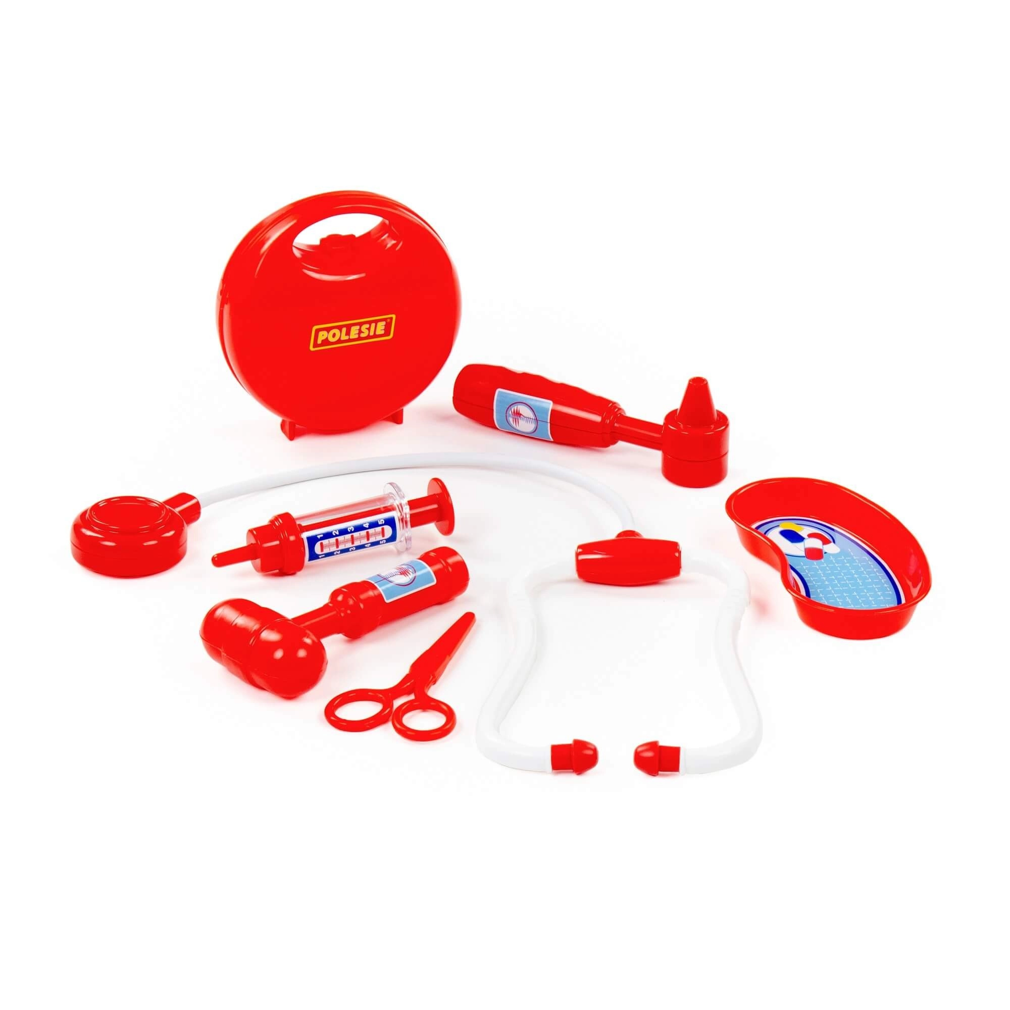 Include stetoscop, seringă, otoscop, ciocănel pentru reflexe, foarfecă și vas renal pentru un joc de-a doctorul autentic.
