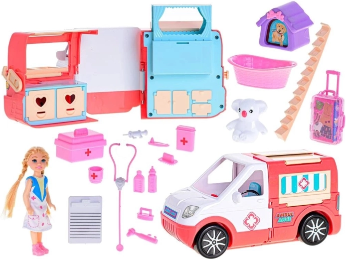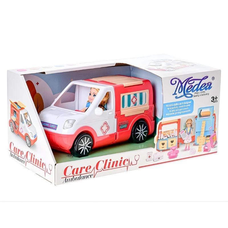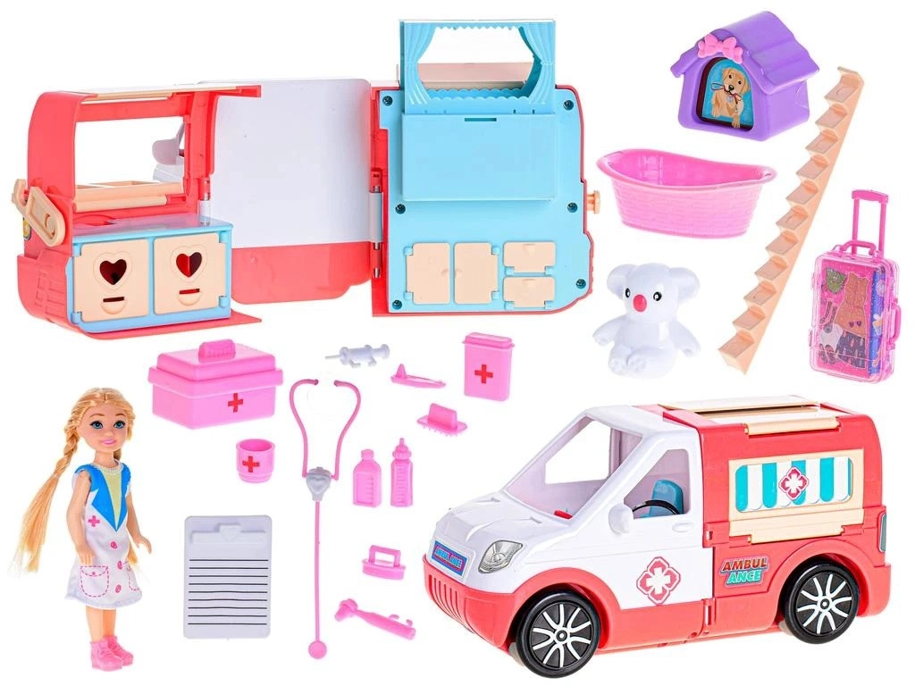 Această clinică mobilă va încânta toți micii îngrijitori. Datorită ușilor care se deschid și interiorului bine gândit, ambulanța se transformă ușor într-un cabinet medical mobil pentru oameni și animăluțe. Setul include o păpușă – șofer de ambulanță, echipamente medicale, servietă, animăluț cu cușcă de transport și alte accesorii pentru misiuni de salvare palpitante.