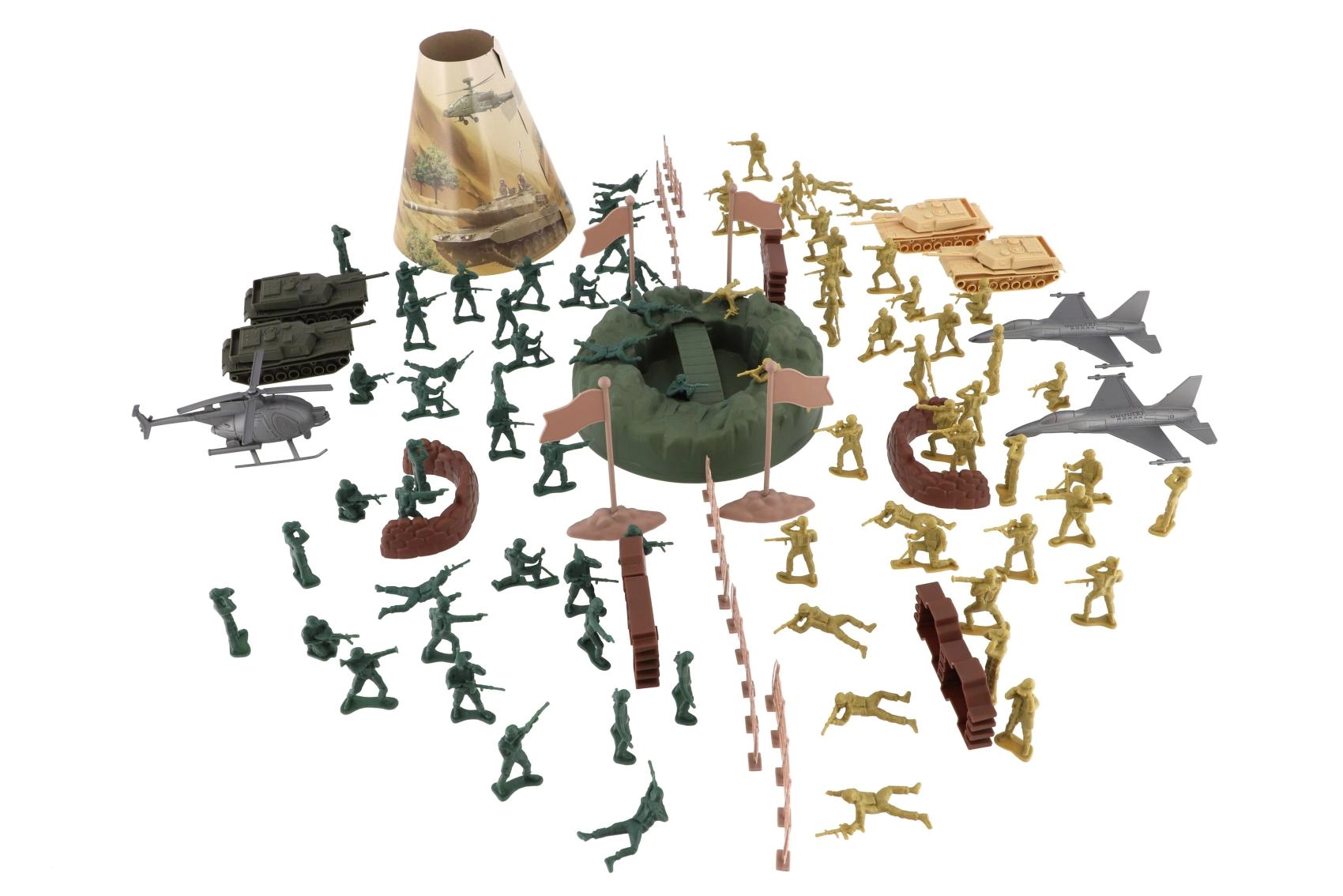 Soldați în diverse poziții, tancuri, avioane de vânătoare și un elicopter oferă realism și mobilitate pentru scenarii captivante.