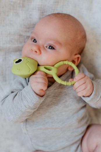 Siliconul moale și elastic masează blând gingiile și ajută la calmarea bebelușului în perioada creșterii dinților. Texturile de pe inel sporesc eficiența masajului.