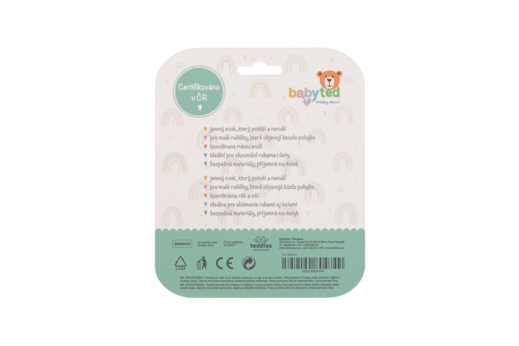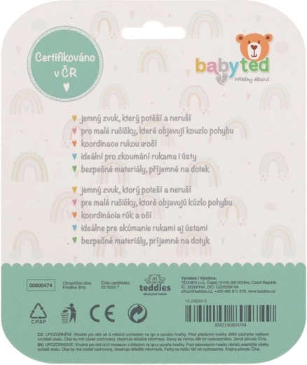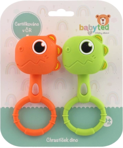Descoperiți setul practic de 2 bucăți de inele de dentiție și zornăitoare BABYTED, în culori vesele și cu un adorabil motiv dino. Datorită siliconului moale și sigur, sunt ideale pentru calmarea gingiilor iritate și, în același timp, sprijină dezvoltarea senzorială a bebelușului. Construcția ușoară și forma bine gândită, cu inel, se potrivesc perfect în mânuțele mici.