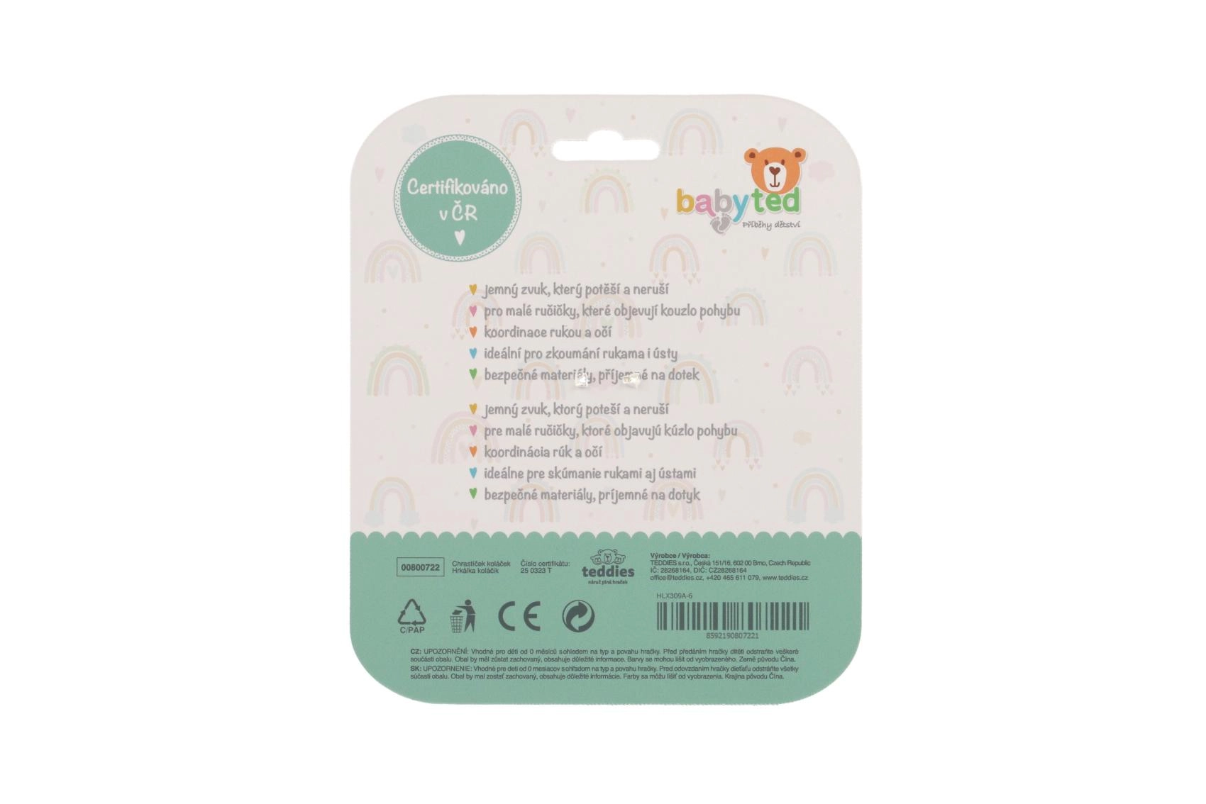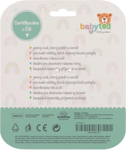 Drăgălașa zornăitoare și inel de dentiție BABYTED este jucăria ideală pentru bebeluși încă de la naștere. Datorită inelului practic se ține ușor chiar și în mânuțe mici, iar siliconul moale masează delicat gingiile în timpul erupției primilor dinți, iar zornăitul fin susține percepția auditivă. Construcția ușoară ajută la dezvoltarea motricității fine, iar designul sigur, ușor de spălat, facilitează utilizarea zilnică.