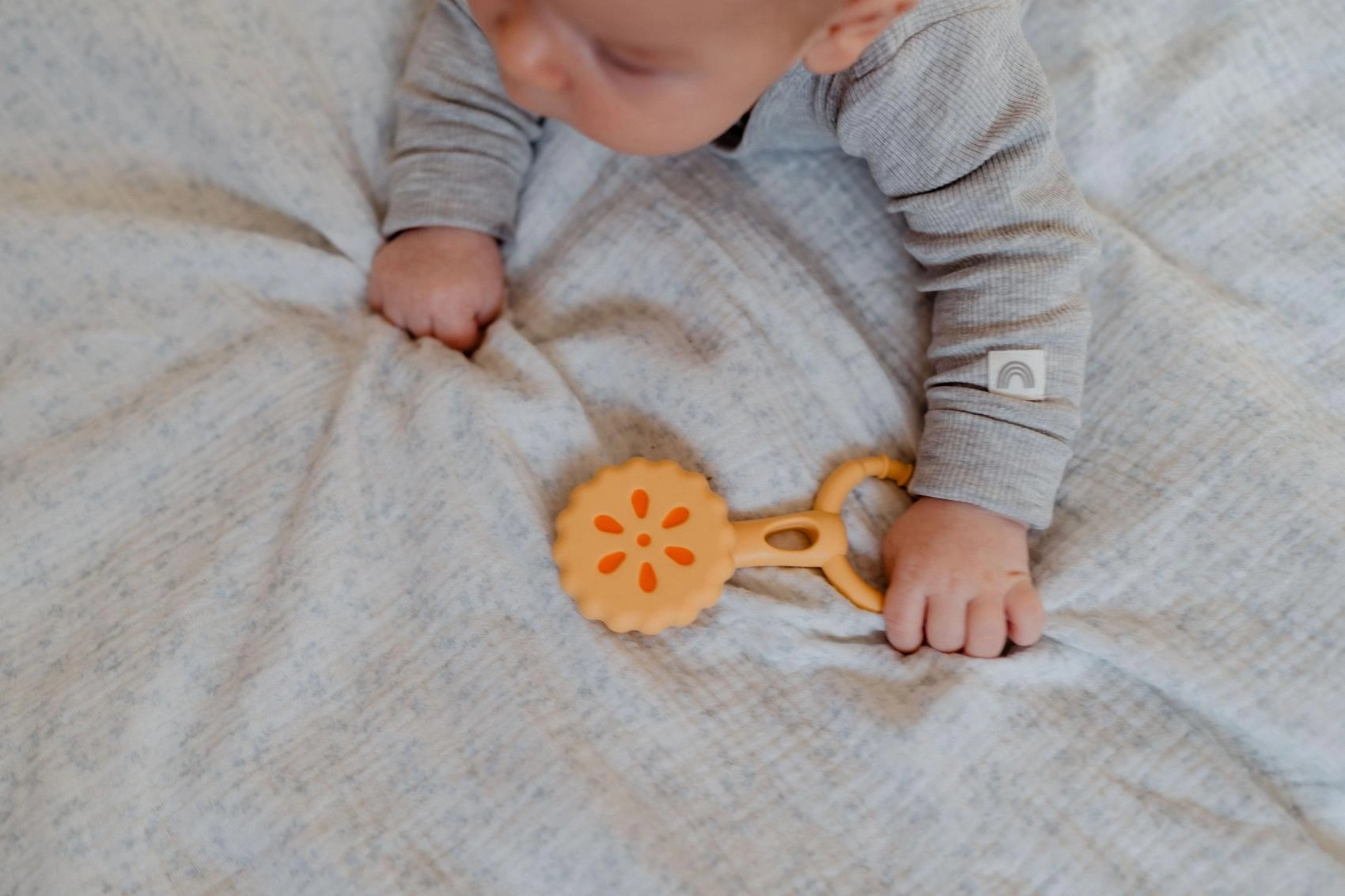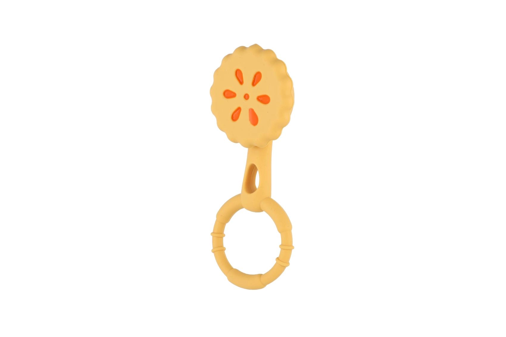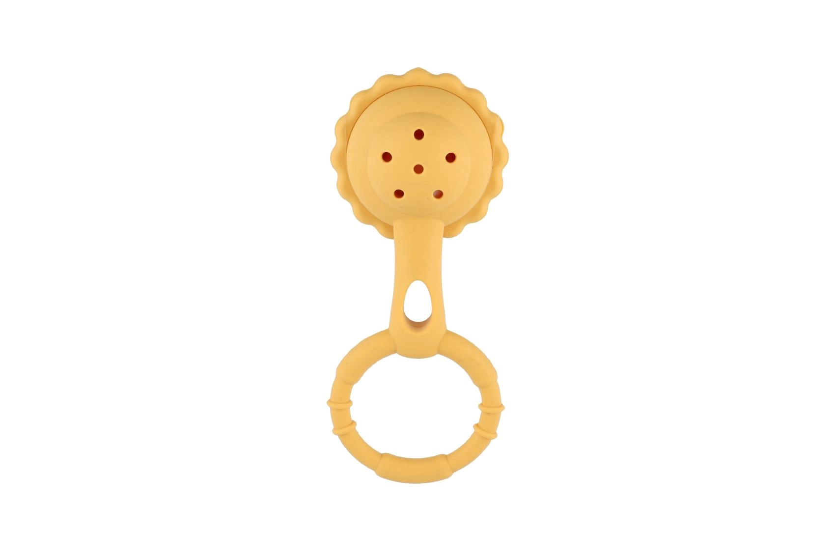 Inelul texturat se ține bine chiar și în mânuțe mici și susține dezvoltarea motricității fine.
