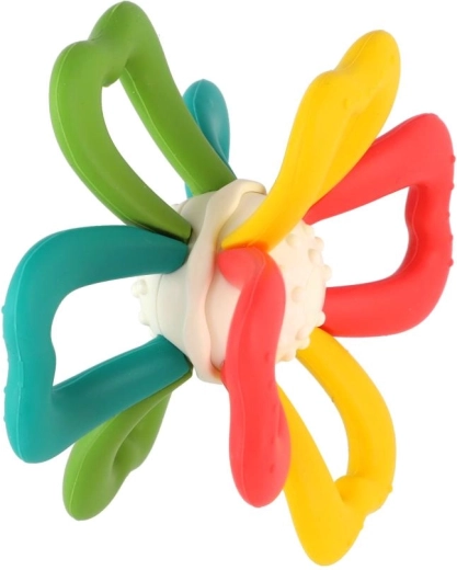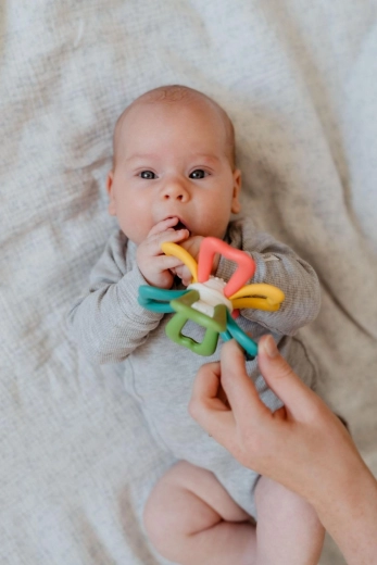 Această jucărie de dentiție colorată, în formă de floare, oferă bebelușilor de la naștere alinare plăcută în timpul erupției primilor dinți și îi încurajează să descopere diferite texturi. „Petalele” moi și flexibile din silicon se țin ușor, susțin prinderea corectă și dezvoltarea motricității fine.