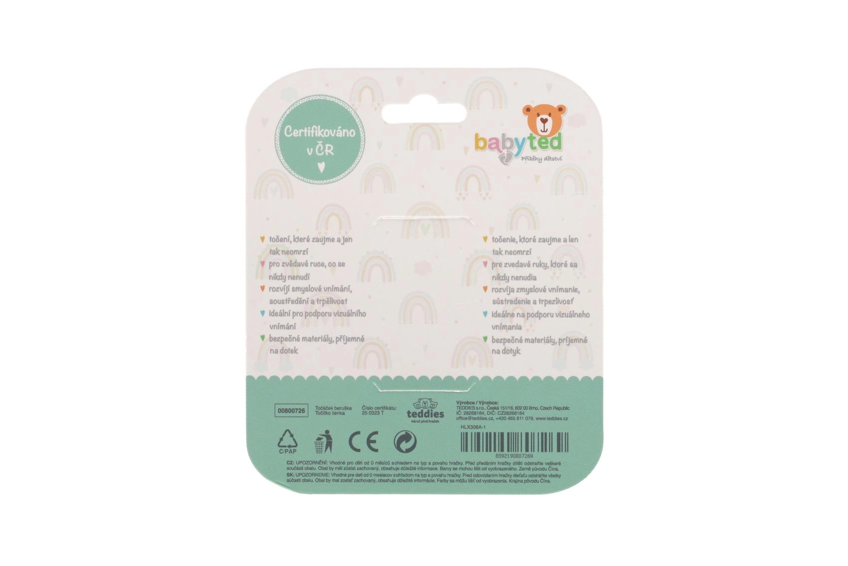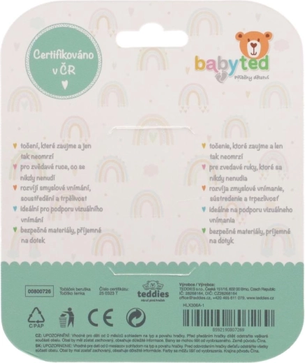 Centrul rotativ și elementele tactile (bule, proeminențe) invită la apăsare, rotire și explorare, dezvoltând în mod natural abilitățile de coordonare, prinderea și motricitatea fină. Roșul contrastant cu buline negre și detaliul verde susțin percepția vizuală și mențin atenția copilului.