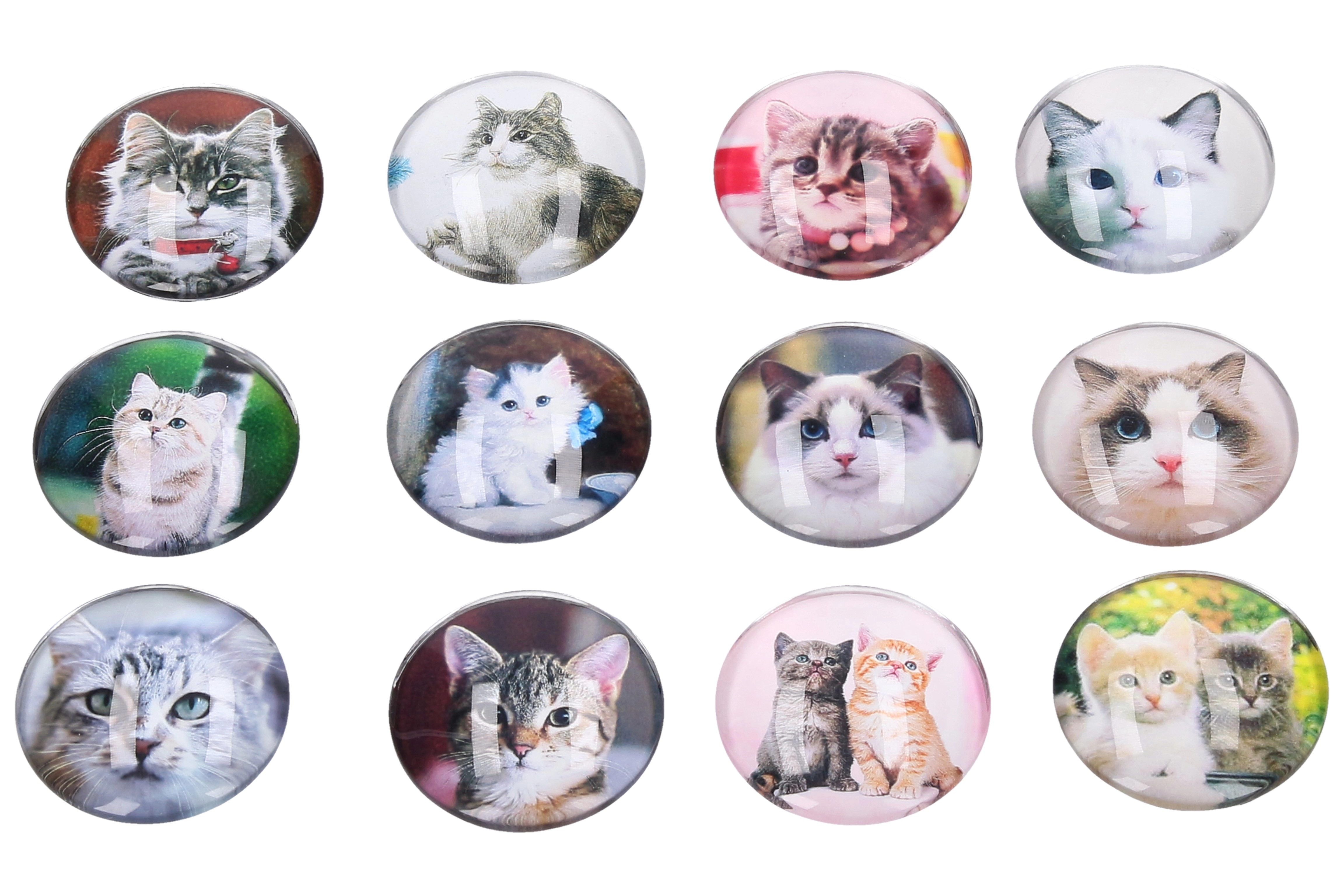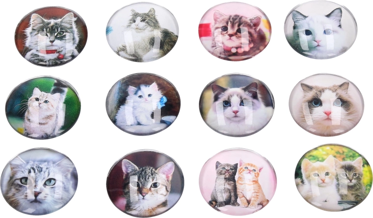 Drăguț magnet din sticlă cu motiv de pisică, cu diametrul de 4 cm, decorează frigiderul, tabla sau biroul. Datorită magnetului puternic aderă bine, iar modelele cu pisici sunt disponibile în mix de variante pentru decor original și utilizare practică.