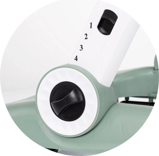 Tampoanele antiderapante, opritoarele, roțile blocabile și reglarea vitezei sunt completate de un scaun moale și o bază largă, stabilă.