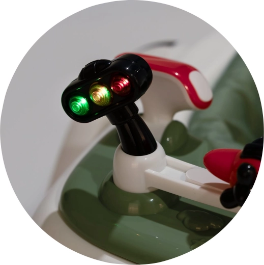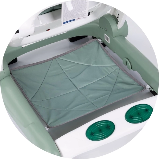 Părinții vor aprecia elementele de siguranță bine gândite: tampoane antiderapante și opritoare, posibilitatea de blocare a roților și reglarea lină a vitezei prin controlerele de la roți. Panoul interactiv cu butoane muzicale colorate, lumini și jucării mobile susține dezvoltarea simțurilor, a imaginației și a motricității fine.