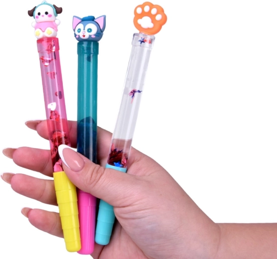 Pachetul ajunge pentru trei pixuri cu gel complete, cu corp transparent, sclipici și rezerve colorate – fiecare va fi un original.