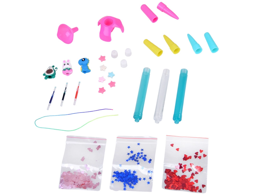 - Totul în pachet: corpuri de pix, rezerve, dopuri, muștiucuri, sclipici, mărgele, topper-e, suport cu pâlnie și șnur