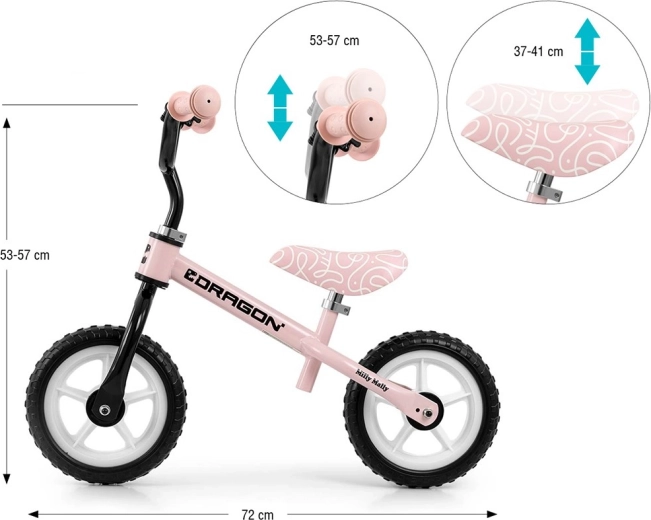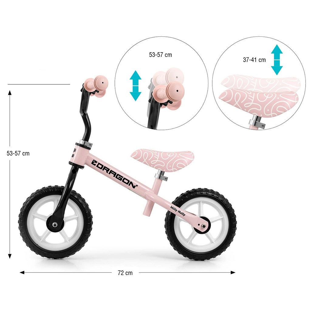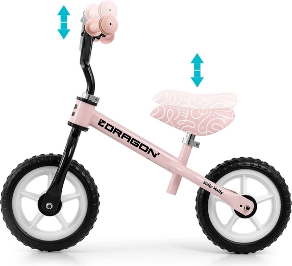 Pornește învățarea echilibrului cu bicicleta de echilibru MILLY MALLY Dragon în culoarea roz. Datorită mersului fără pedale, copiii se pot concentra ușor pe menținerea echilibrului și coordonare. Cadru din oțel ușor, dar rezistent, roți din spumă de 10" pentru o deplasare lină, șea și ghidon reglabile și limitare a rotației ghidonului pentru siguranță sporită – tot ce are nevoie micul rider. Include și un clopoțel îndrăgit de copii.