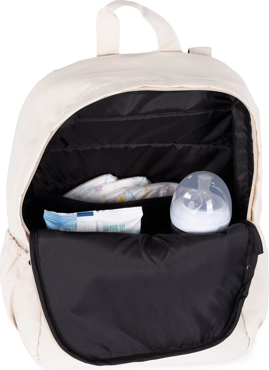 Compartimentul principal cu capacitate mare și multiple buzunare găzduiește scutece, biberoane, șervețele și hăinuțe, păstrând totul ordonat și ușor de găsit.