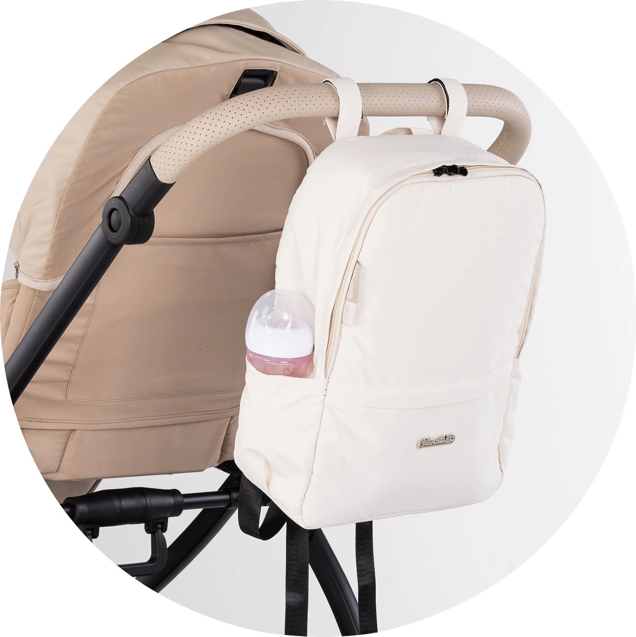 Se transportă ușor cu mânerul superior și, datorită chingilor, poate fi prins de cărucior pentru acces rapid la necesarul bebelușului.
