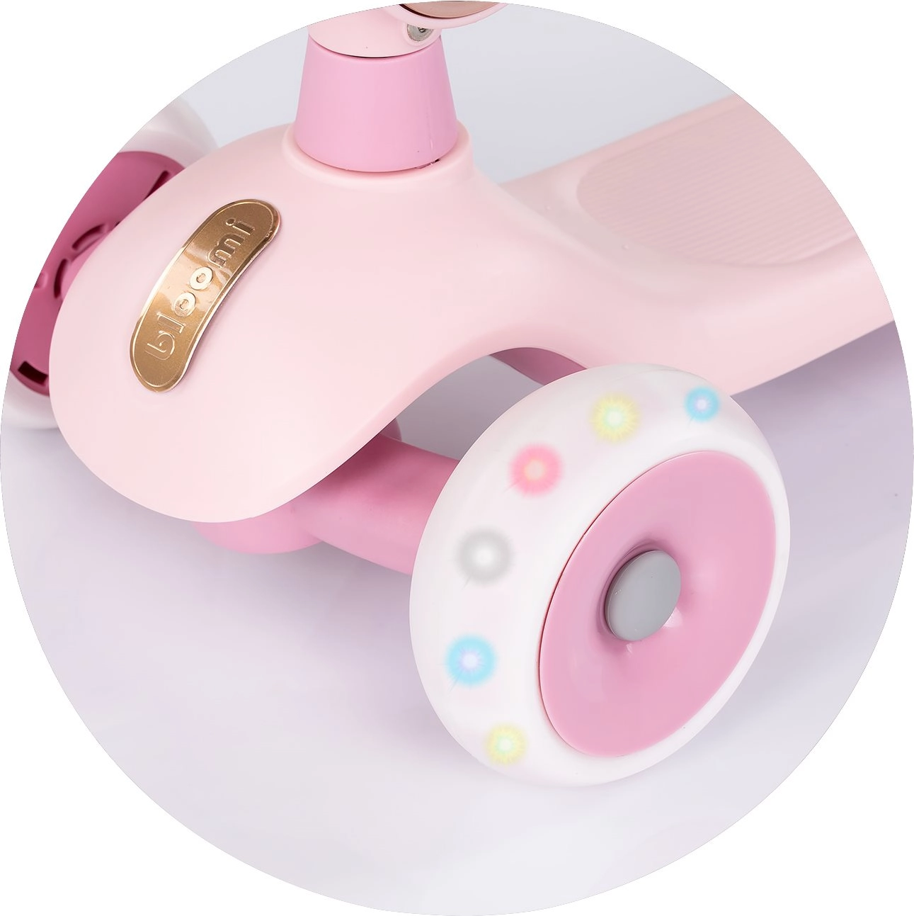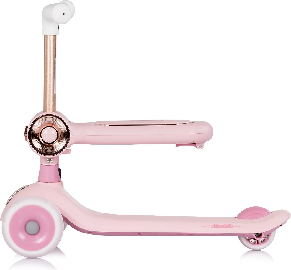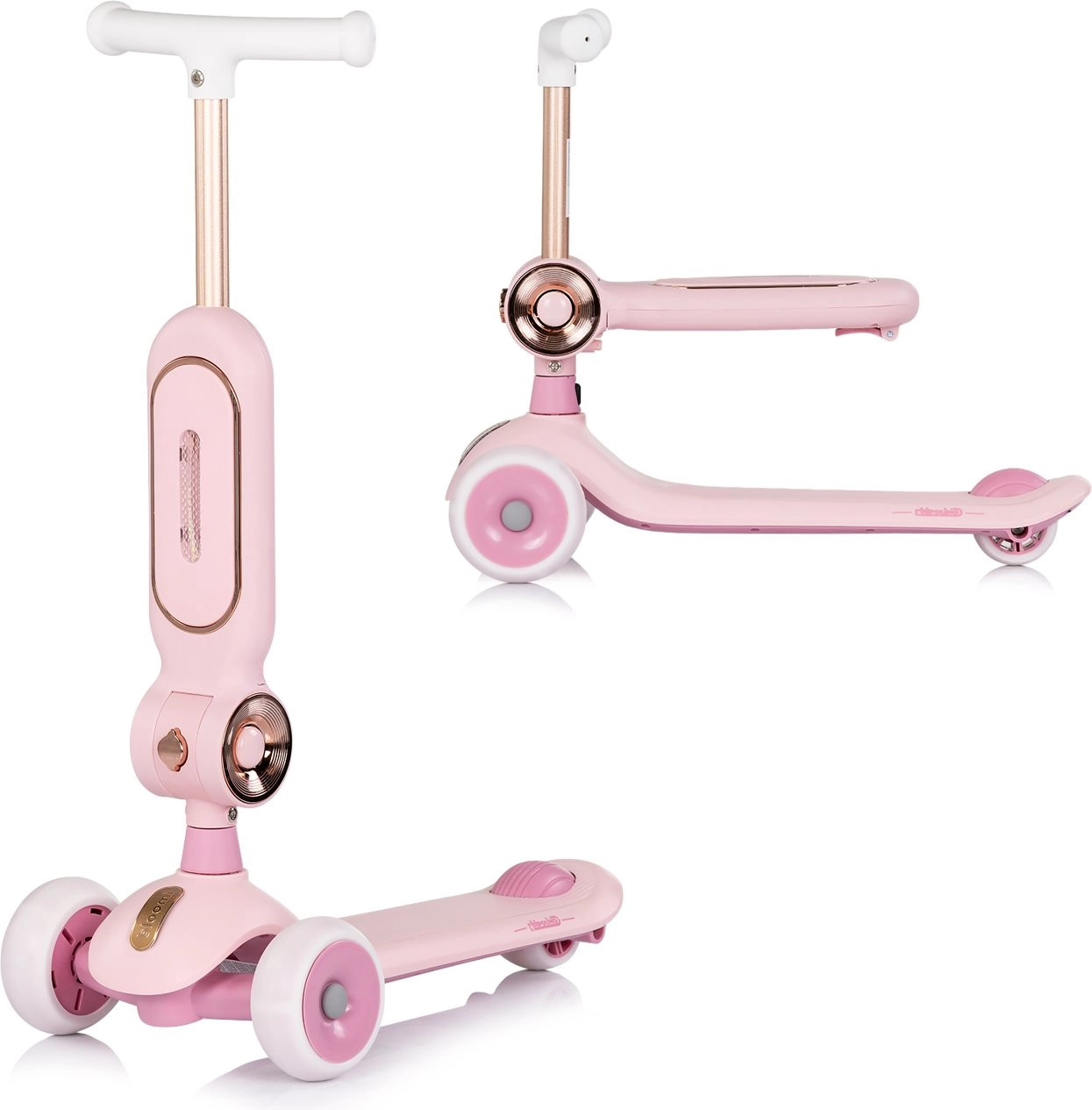 Trotineta pentru copii 2 în 1 CHIPOLINO Bloomi în culoarea roz combină trotinetă și bicicletă de echilibru pentru versatilitate maximă. Oferă structură stabilă cu trei roți, roți PU luminoase, suprafață lată antiderapantă pentru picior și frână de picior spate pentru o plimbare sigură și distractivă. Șezutul oferă sprijin copiilor mai mici și susține dezvoltarea echilibrului și coordonării.