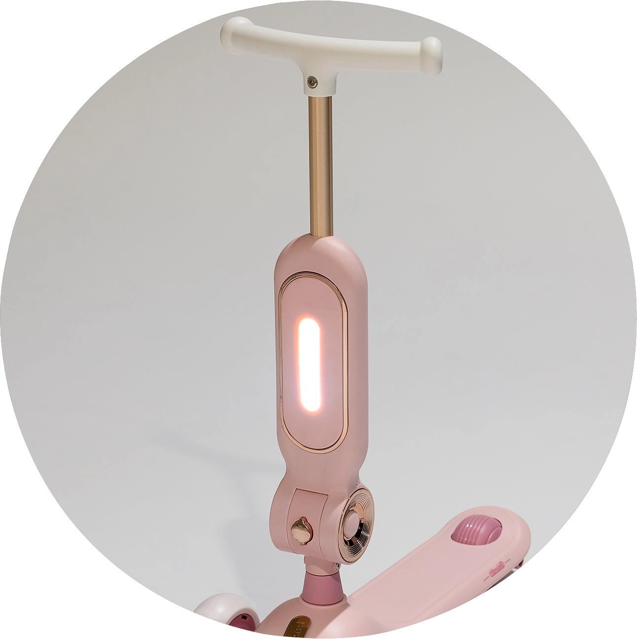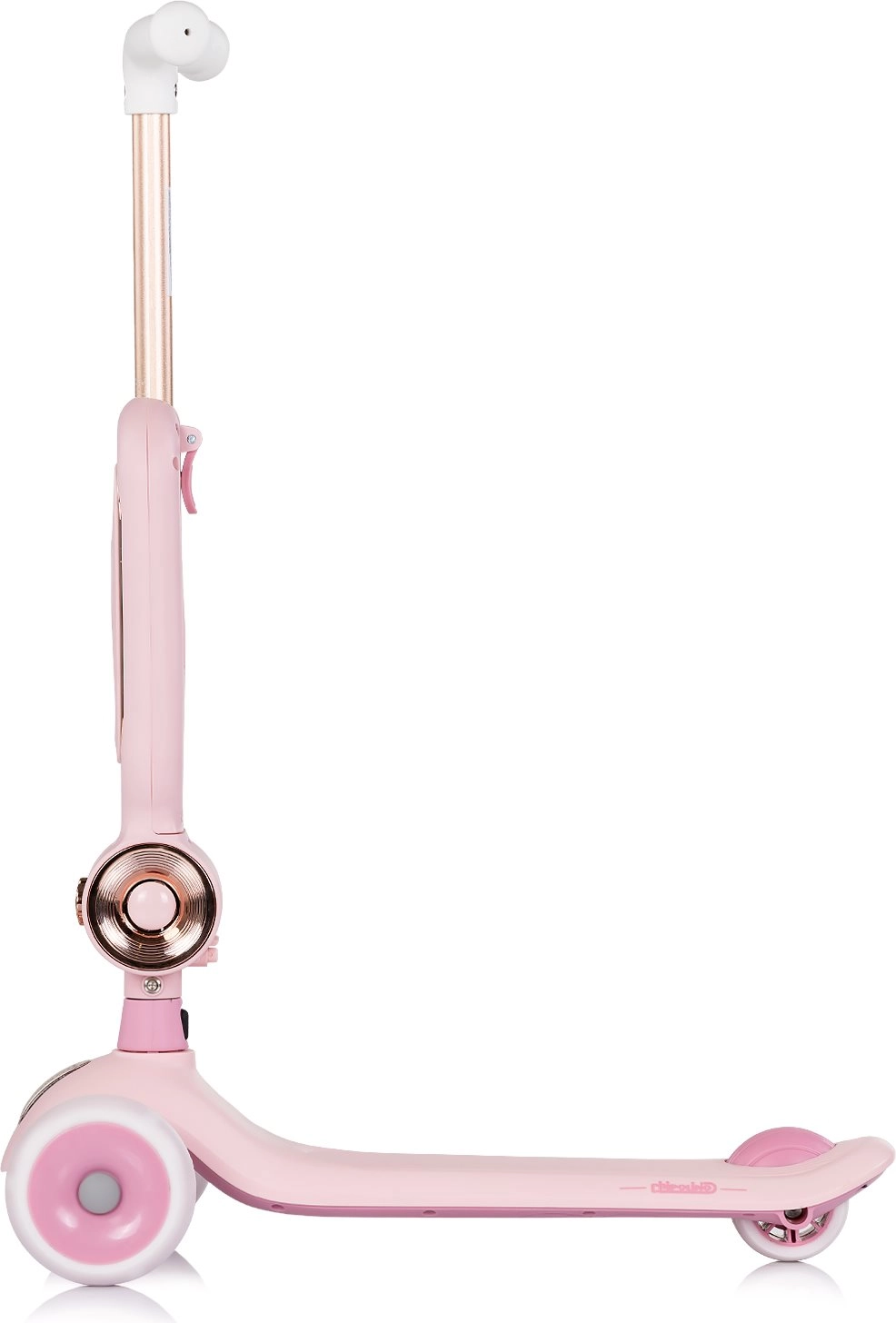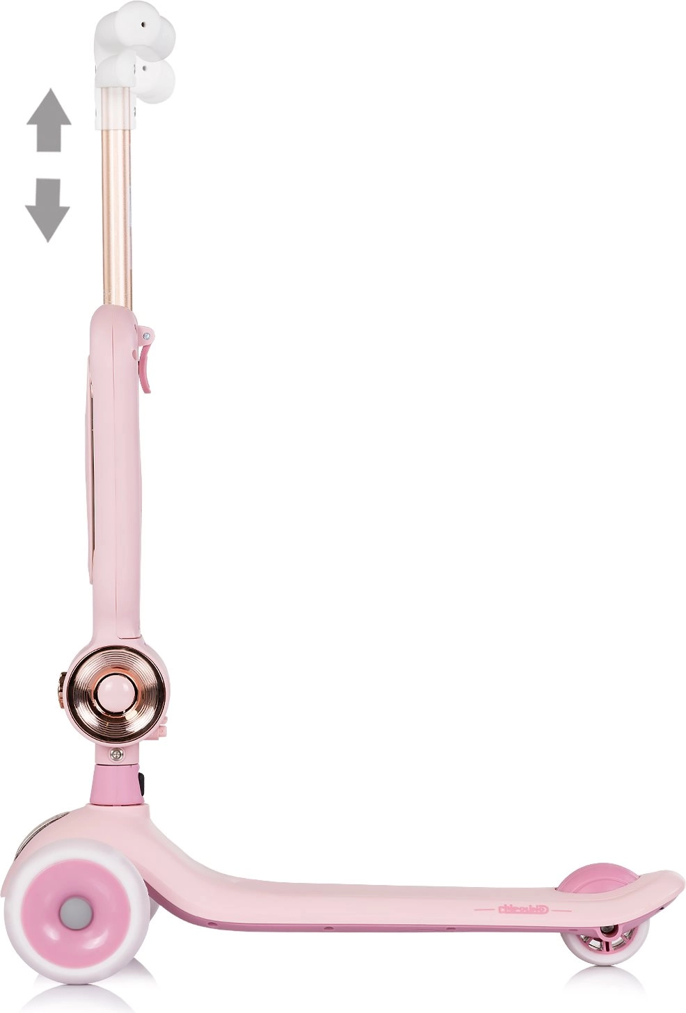 Trotineta pentru copii 2 în 1 CHIPOLINO Bloomi în culoarea roz combină trotinetă și bicicletă de echilibru pentru versatilitate maximă. Oferă structură stabilă cu trei roți, roți PU luminoase, suprafață lată antiderapantă pentru picior și frână de picior spate pentru o plimbare sigură și distractivă. Șezutul oferă sprijin copiilor mai mici și susține dezvoltarea echilibrului și coordonării.