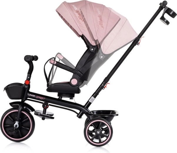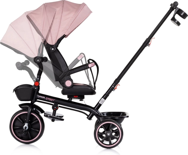Descoperă o plimbare confortabilă și sigură cu tricicleta CHIPOLINO Max Sport 2în1, culoarea Powder Pink. Acest model crește odată cu copiii și oferă două moduri de utilizare – control parental cu mâner de ghidare și pedalare independentă de către copil. Datorită scaunului rotativ 360°, căptușelii moi, centurii de siguranță și copertinei pliabile cu parasolar, plimbarea este mereu confortabilă și protejată. Sunt incluse coș față și coș spate, suport rabatabil pentru picioare și mâner parental ajustabil pentru confort maxim.