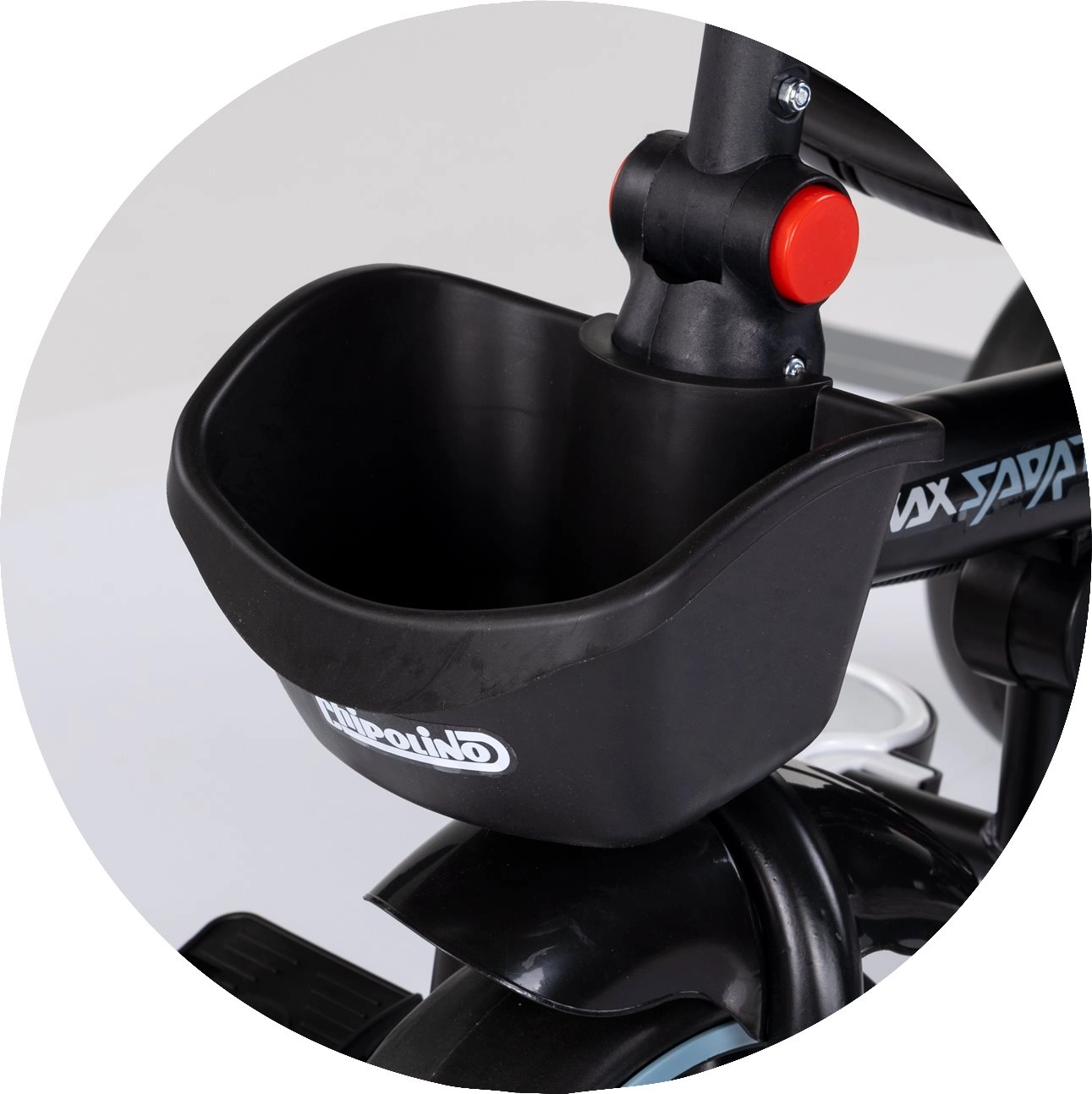 Ergonomia atent gândită include scaun lat și moale, cu tapițerie, reglaj și rotație la 360° pentru urcare ușoară și schimbare de direcție. Copilul se bucură de confort prin repose-picioare rabatabile și siguranță prin centura de prindere. Dotări practice precum suportul pentru băuturi și coșulețul frontal și cel posterior sunt utile pentru jucării și mărunțișuri.