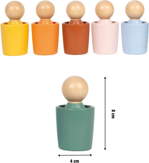 Acest set din lemn de înaltă calitate aduce copiilor bucuria învățării prin joc. Datorită potrivirii cromatice a figurinelor cu paharele, copiii își însușesc în mod natural recunoașterea culorilor, exersează priza și precizia mișcării și își dezvoltă gândirea logică. Prin introducerea, scoaterea și stivuirea paharelor se dezvoltă, de asemenea, răbdarea și simțul pentru ordine.