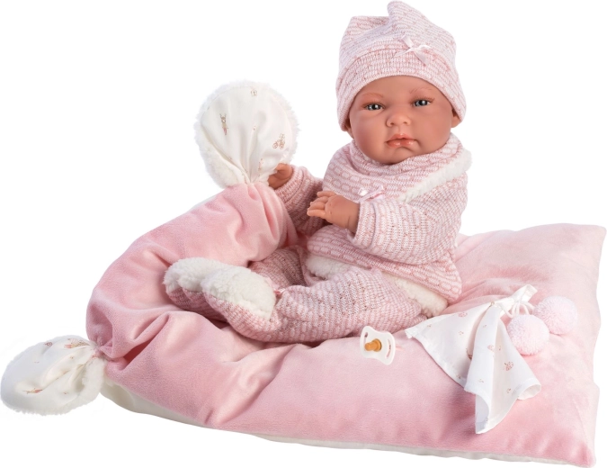 Setul de haine stilat și călduros pentru păpușă aduce tot ce au nevoie micii îngrijitori: piese tricotate moi cu blăniță fină, o jucărie de strâns cu ciucuri și o pernuță decorativă ce poate fi folosită și ca salteluță confortabilă. Totul este conceput pentru păpușile Llorens NEW BORN de 40–42 cm.