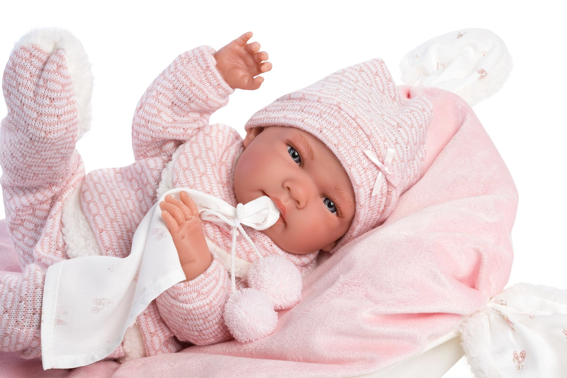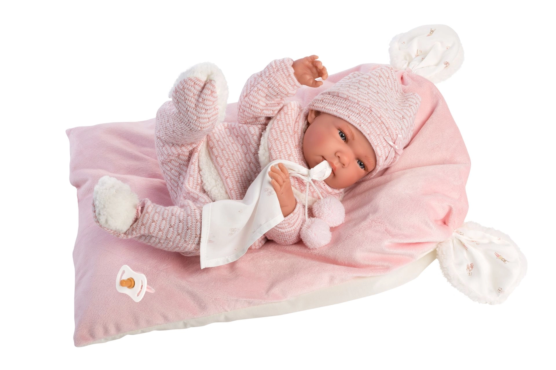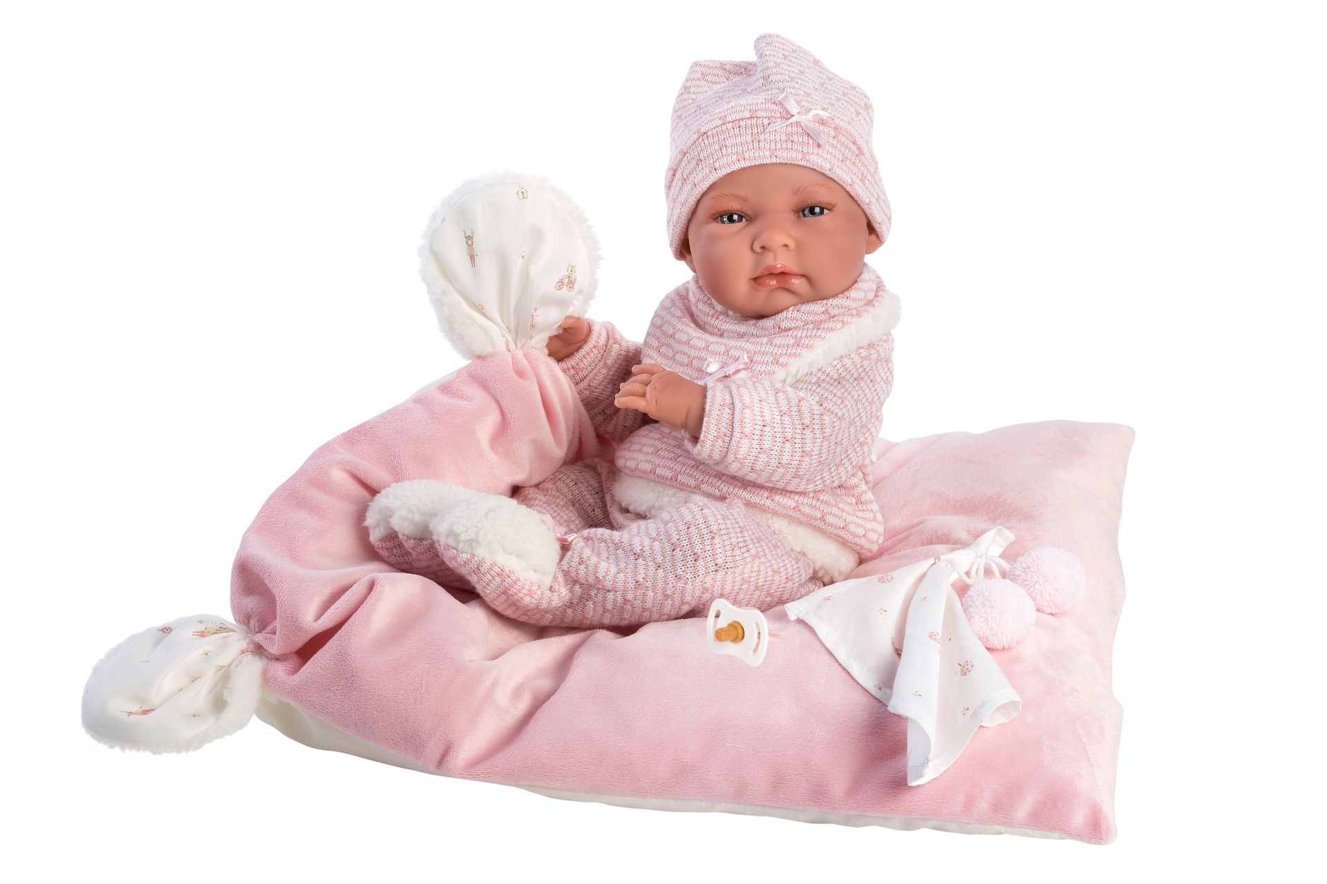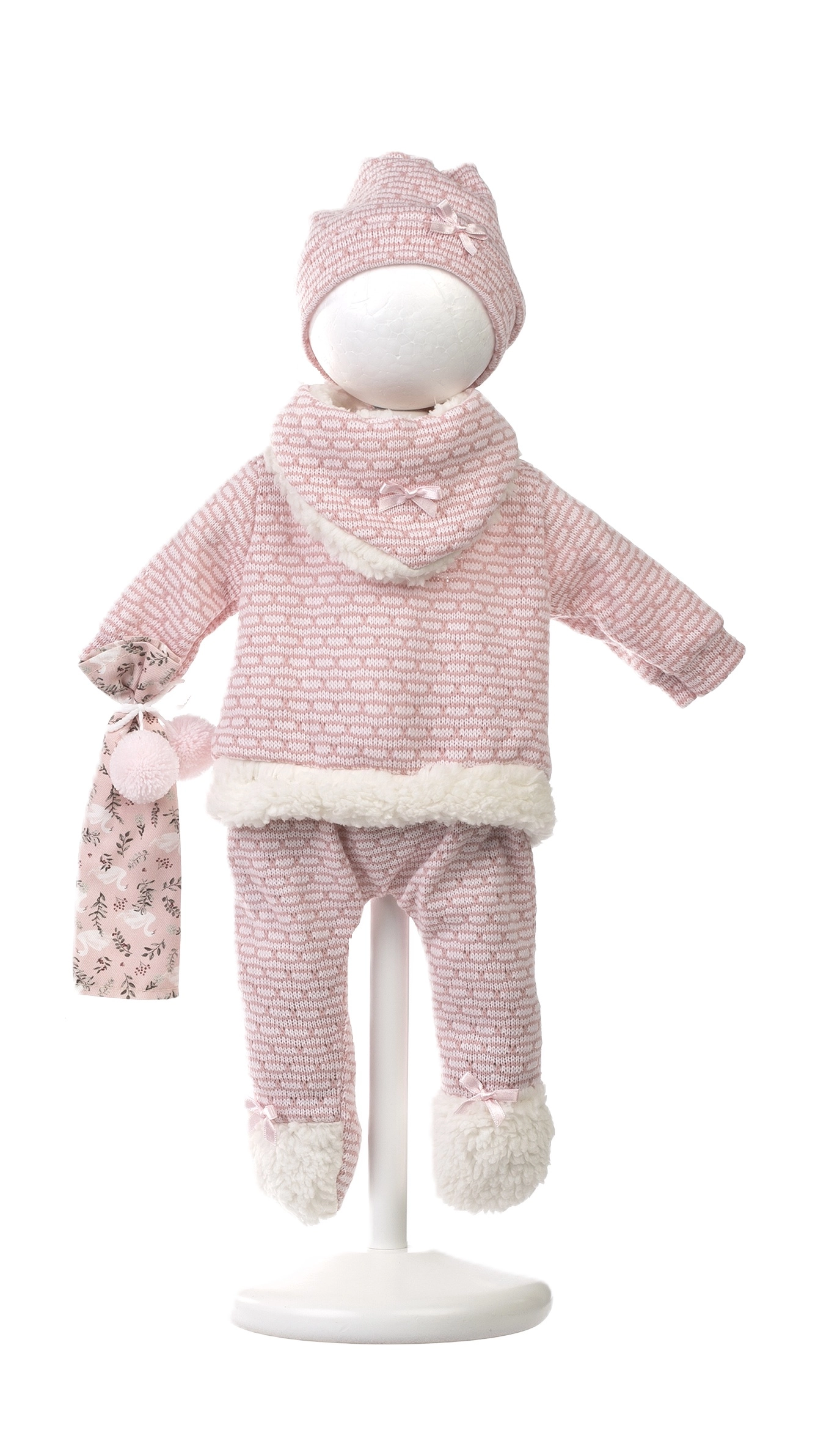 - Echipare completă – 4 piese de îmbrăcăminte călduroasă, jucărie de strâns cu ciucuri și pernuță/salteluță.
