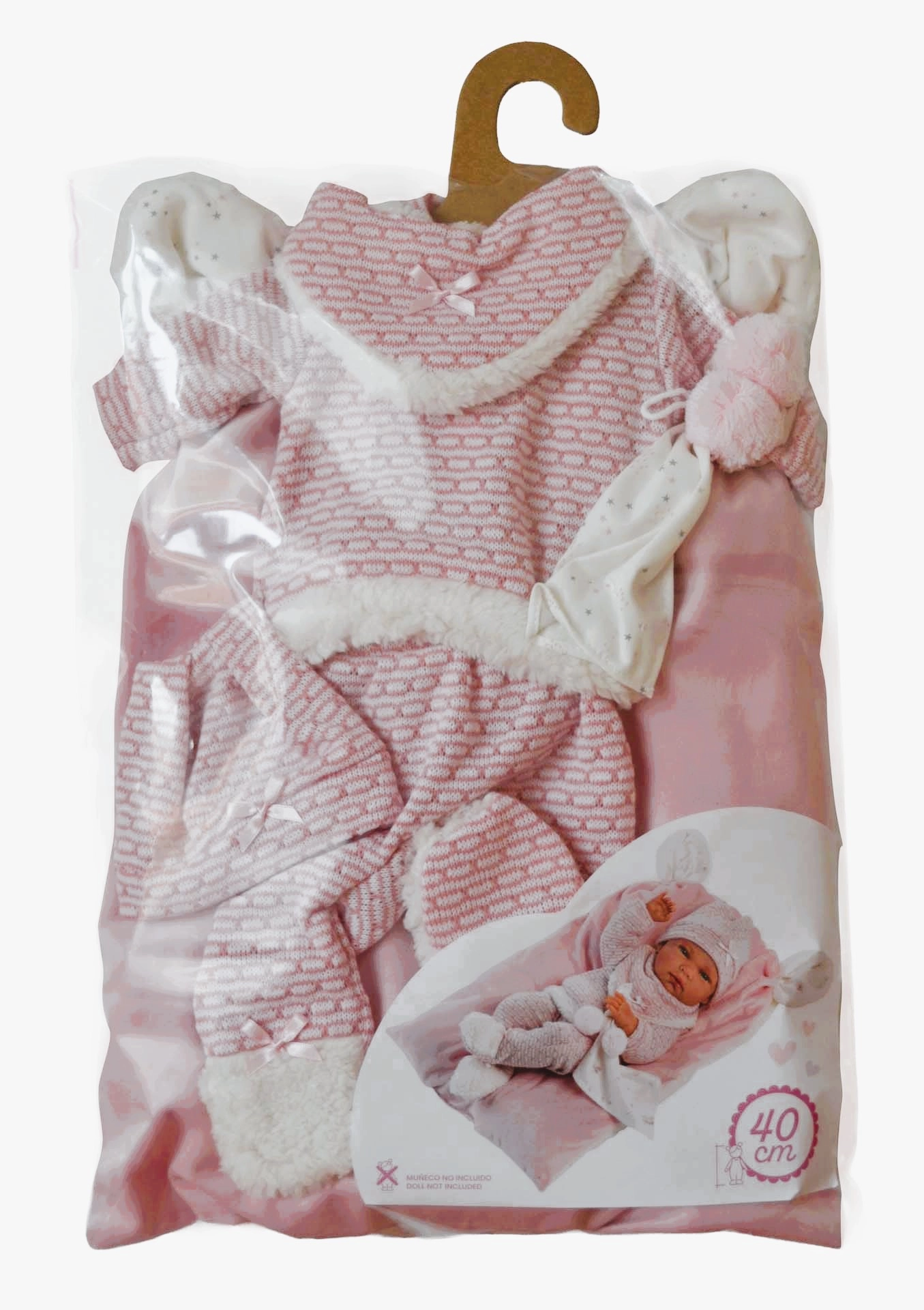 Set adorabil de 5 piese de hăinuțe pentru păpușa NEW BORN de la Llorens, pentru mărimea 40–42 cm, care include piese tricotate călduroase, o jucărie de strâns cu ciucuri și o perniță/salteluță moale. Realizat manual în Spania, ideal pentru jocuri de îngrijire și dezvoltarea motricității fine. Ambalaj cu umeraș pentru depozitare ușoară.