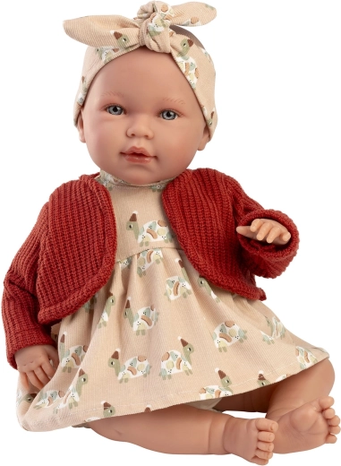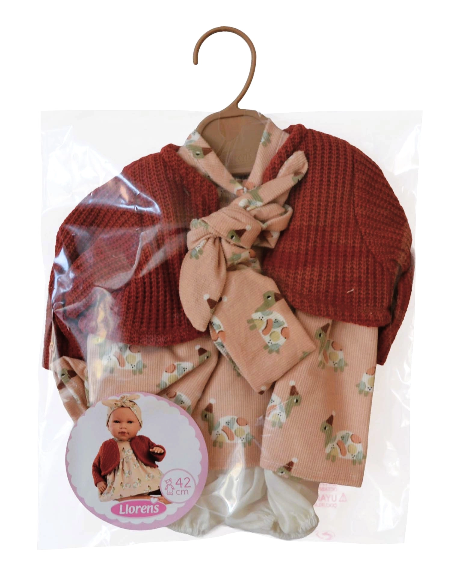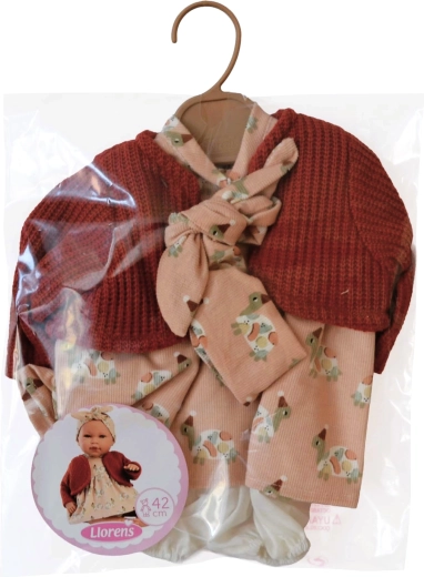 Set stilat din 4 piese de hăinuțe pentru păpușa New Born de la Llorens, pentru mărimea 40–42 cm. Realizat manual în Spania din materiale de calitate, livrat într-un ambalaj practic cu umerăraș. Ideal pentru dezvoltarea imaginației și a grijii în timpul jocului. Recomandat de la 3 ani.