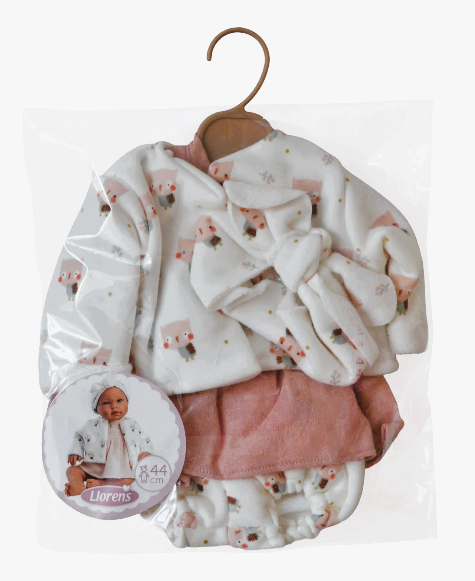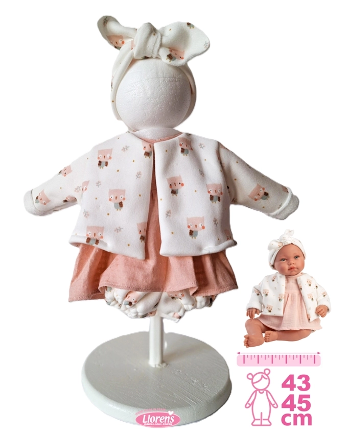 Set stilat din 4 piese de hăinuțe pentru păpușa New Born de la Llorens, potrivită pentru mărimea 43–45 cm. Fabricat manual în Spania cu accent pe calitate și detalii. Ambalaj practic din folie cu umeraș pentru depozitare ușoară. Potrivit pentru copii de la 3 ani.
