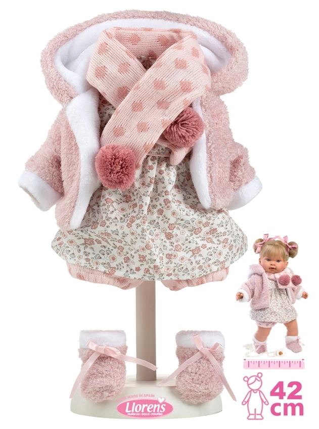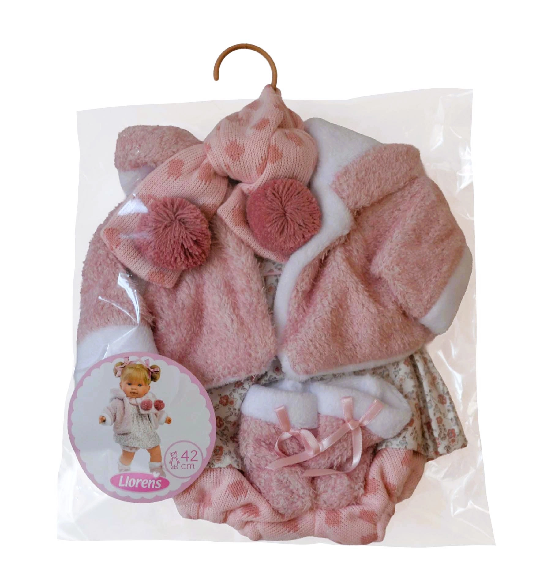 Setul stilat pentru păpuși LLORENS, mărimea 42 cm, va încânta orice mică fashionistă. Conține 5 piese atent asortate din țesături moi – o jachetă roz pufoasă cu tiv alb, căciulă/eșarfă cu ciucuri, mănuși și rochiță cu chiloței cu motiv floral. Hăinuțele sunt realizate manual în Spania și sunt livrate într-un ambalaj practic cu umeraș. Ideal pentru jocul de rol și dezvoltarea motricității fine. Potrivit de la 3 ani.