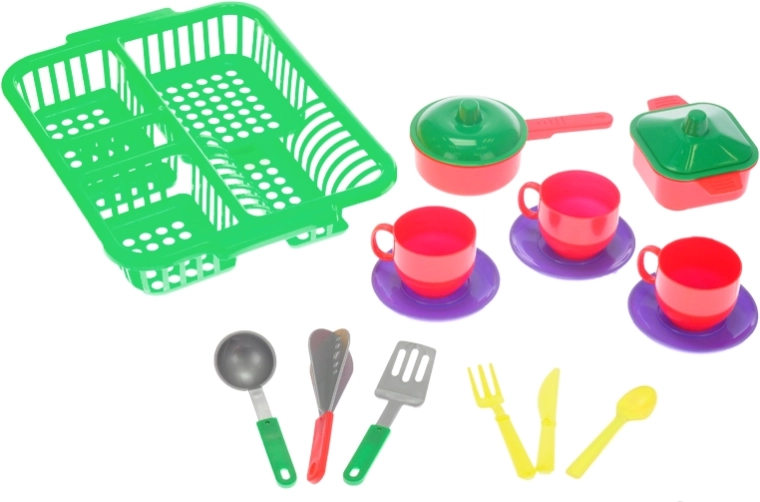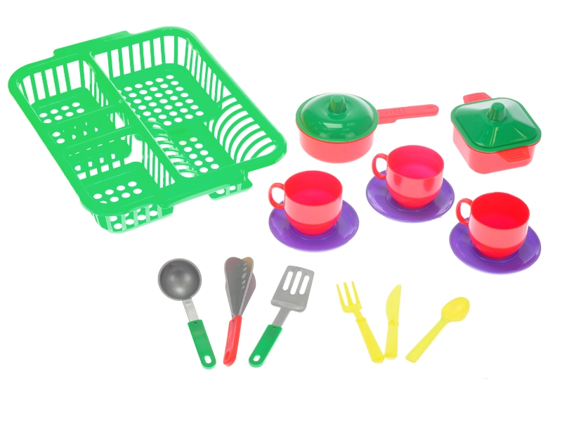 Acest set de veselă pentru copii, cu un uscător practic, oferă tot ce este necesar pentru joaca de-a gătitul și făcutul curățeniei în bucătărie. Datorită celor trei variante de culori, joaca devine și mai variată, iar copiii își pot crea cu ușurință propriile ritualuri în bucătărie.