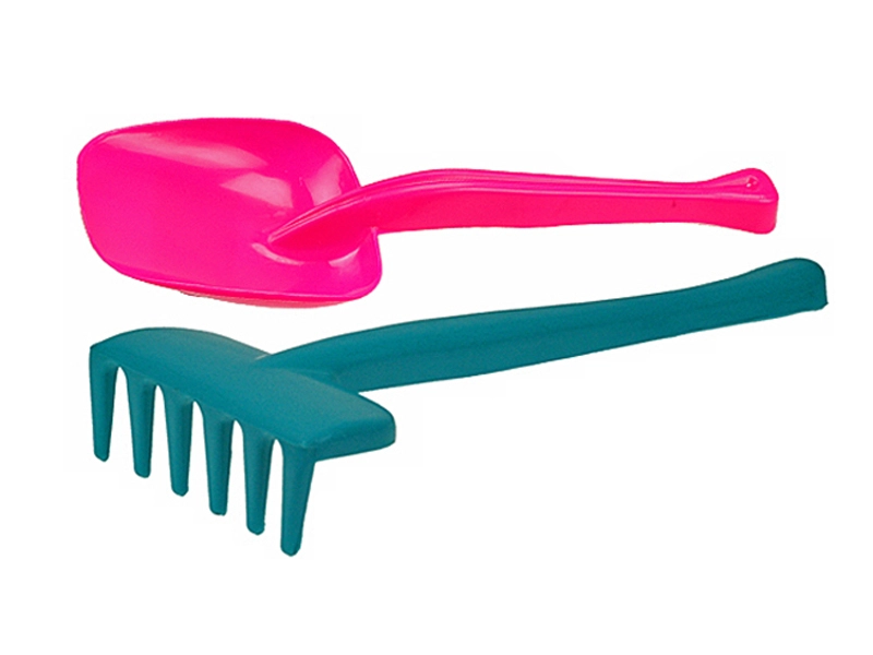 Lopățica și grebla au forme netede, rotunjite și mânere confortabile, pentru ca cei mici să le poată prinde bine și manevra ușor la joaca în nisip sau în grădină.