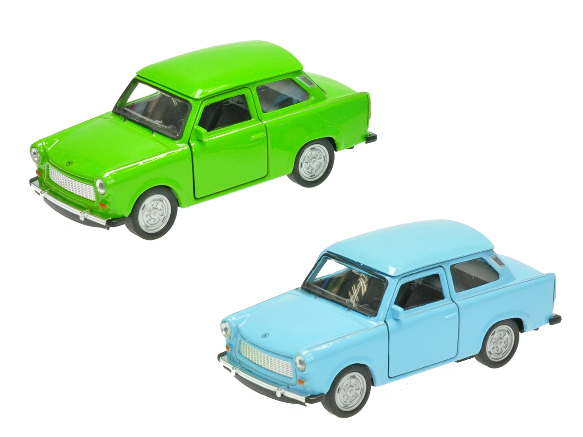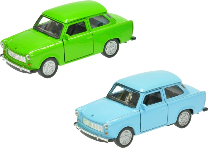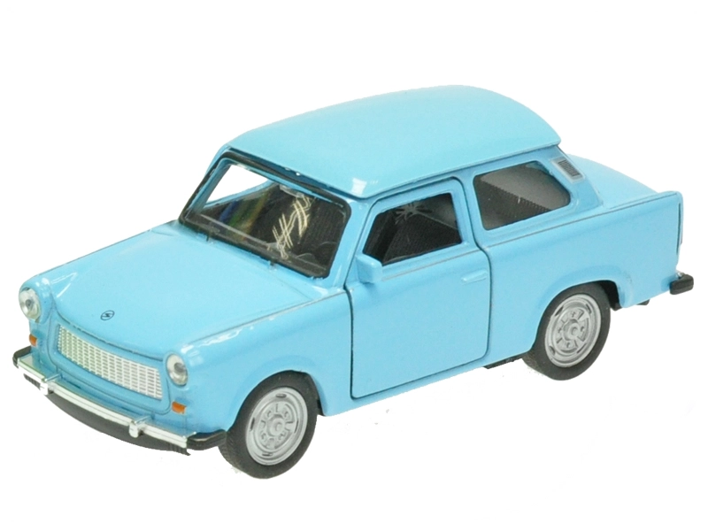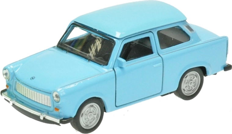 Model metalic detaliat al legendarului autoturism TRABANT 601 de la Welly, la scara 1:36, care îi va încânta atât pe copii, cât și pe colecționari. Oferă uși deschise, mecanism de întoarcere (pull-back) pentru o deplasare distractivă și o construcție rezistentă din metal și plastic. Lungimea modelului este de 11 cm și este disponibil în culorile albastru, verde și alb. Potrivit de la 3 ani.
