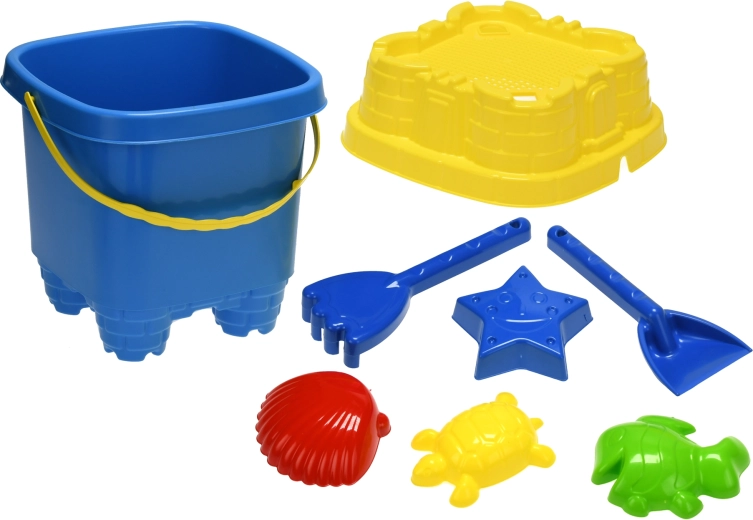 - Set complet: găletușă cu capac, lopățică, greblă și 4 forme (10–11 cm)