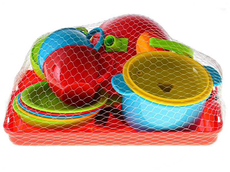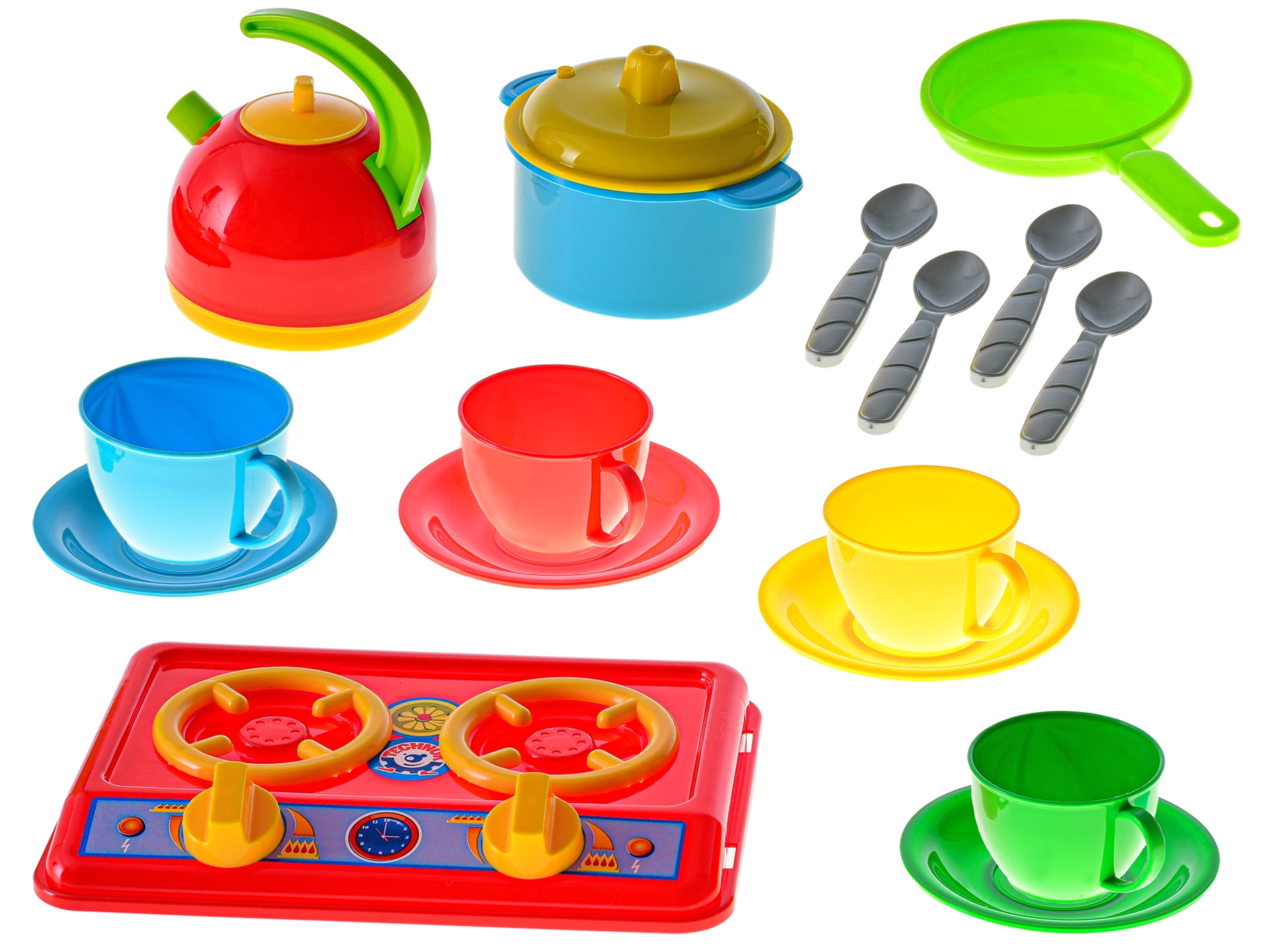Aragaz cu două ochiuri, ceainic, oală cu capac, tigaie și un serviciu de ceai colorat stimulează jocul creativ și jocul de rol.