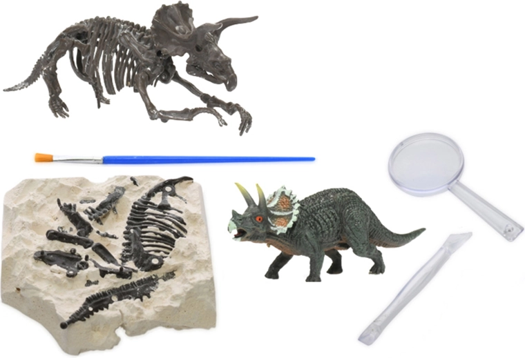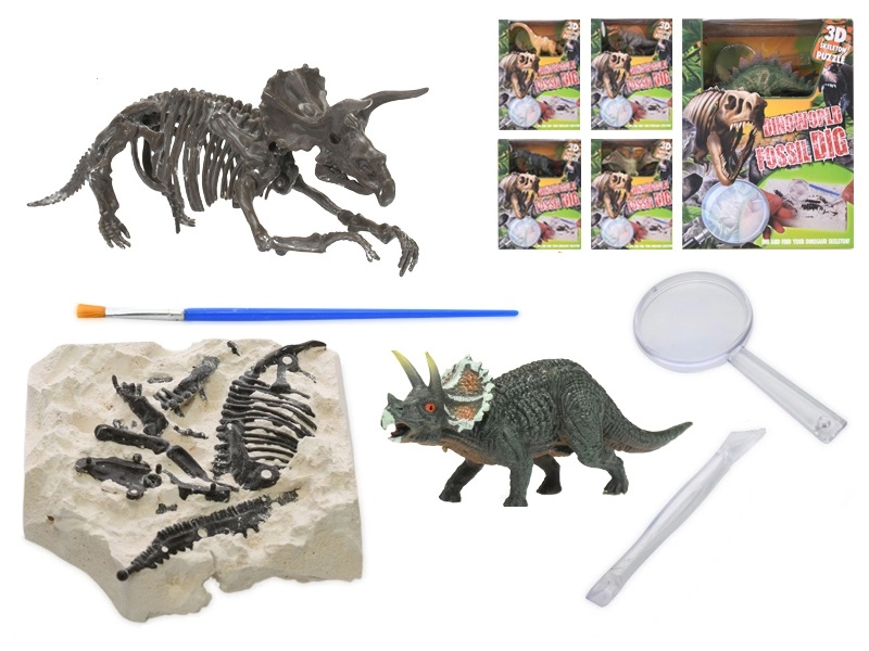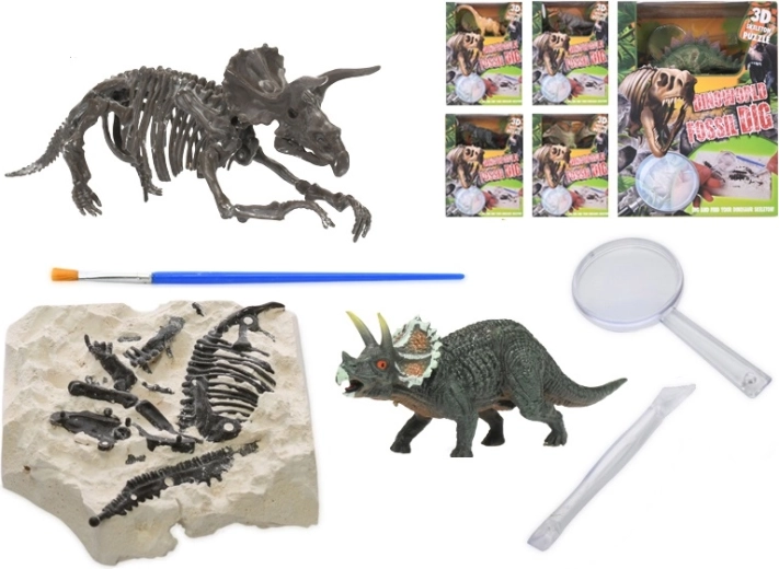 - Echipare completă în pachet: bloc de ipsos cu fosilă, daltă, lupă, pensulă și figurină de dinozaur.