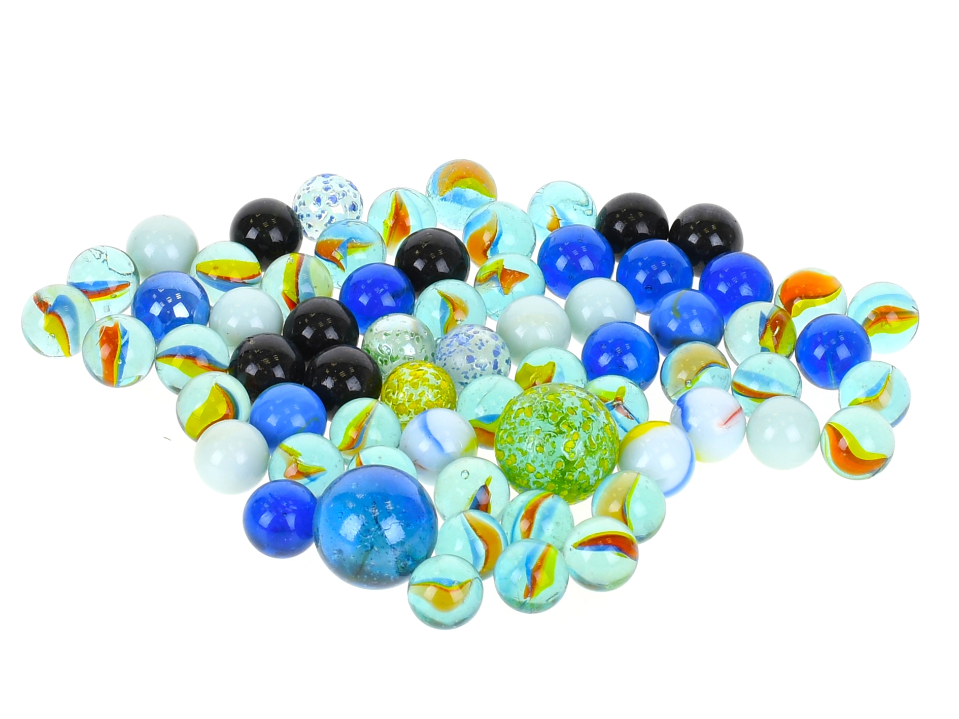 În pachet găsești aproximativ 80 de bile în diferite dimensiuni și combinații de culori – de la tonuri de albastru și turcoaz până la variații negre și verzi, cu elegante vârtejuri. Setul este grozav pentru joacă, competiții, dezvoltarea motricității fine și ca umplutură decorativă pentru boluri și vaze.