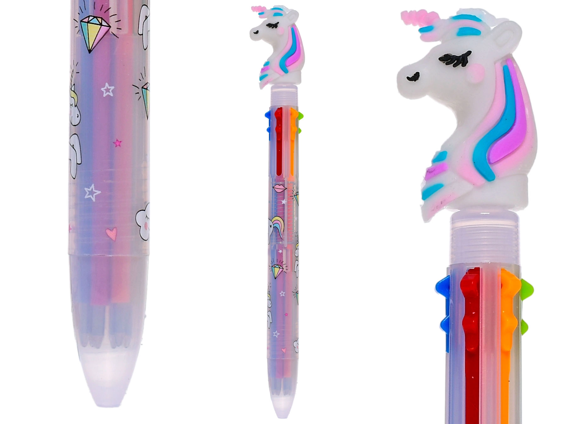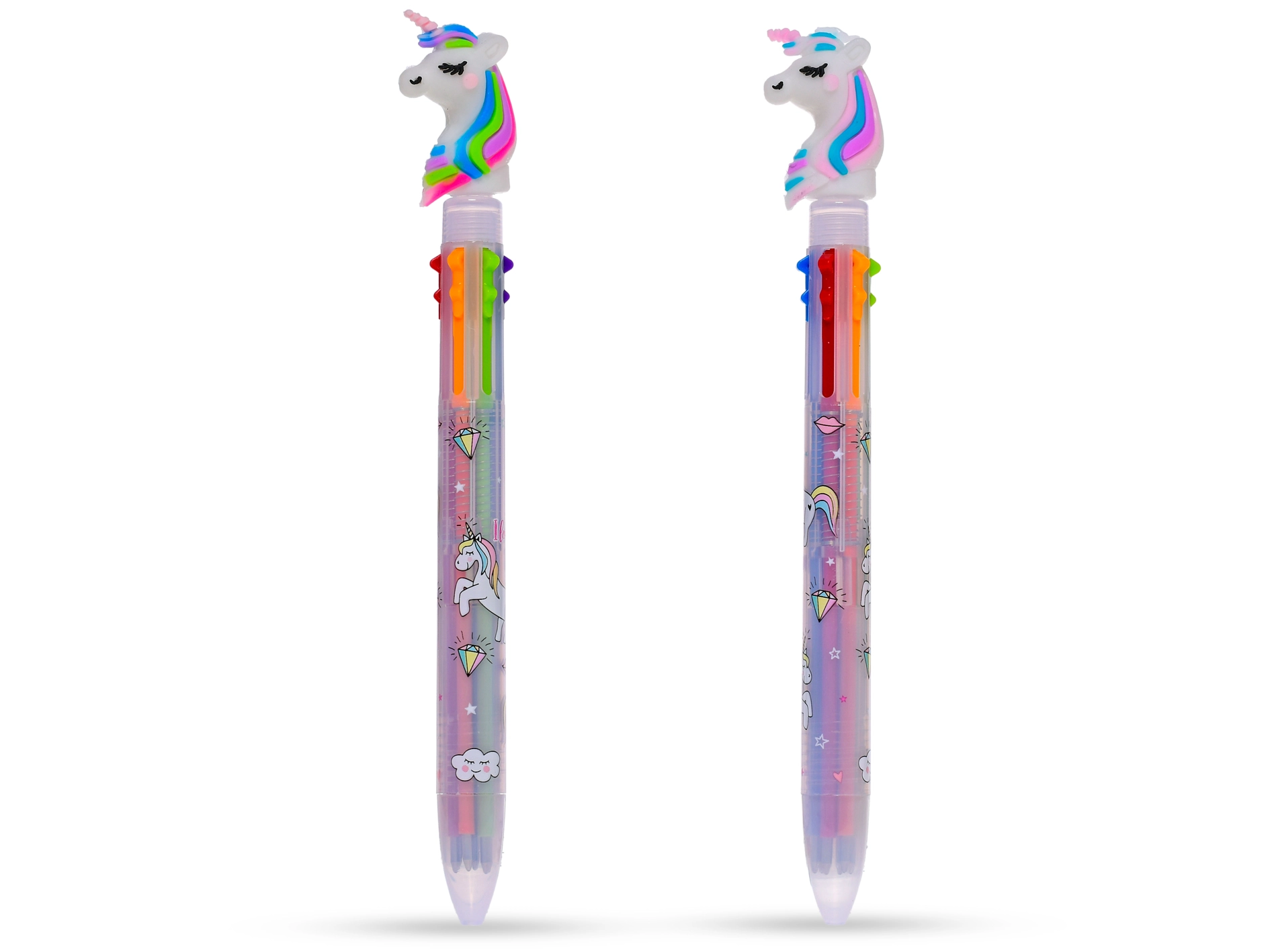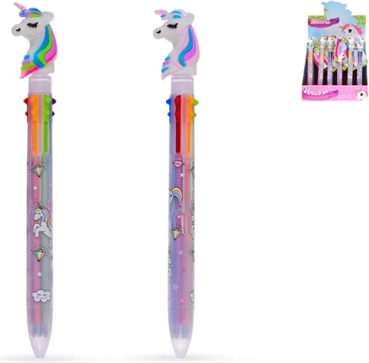 Pixul curcubeu cu unicorn este o alegere excelentă pentru micii creatori care iubesc culorile și imaginația. Datorită mecanismului inteligent, comuți ușor între șase culori într-un singur pix și dai viață notițelor, desenelor și proiectelor școlare. Construcția ușoară și rezistentă din plastic asigură priză confortabilă chiar și pentru mâinile mici ale copiilor.