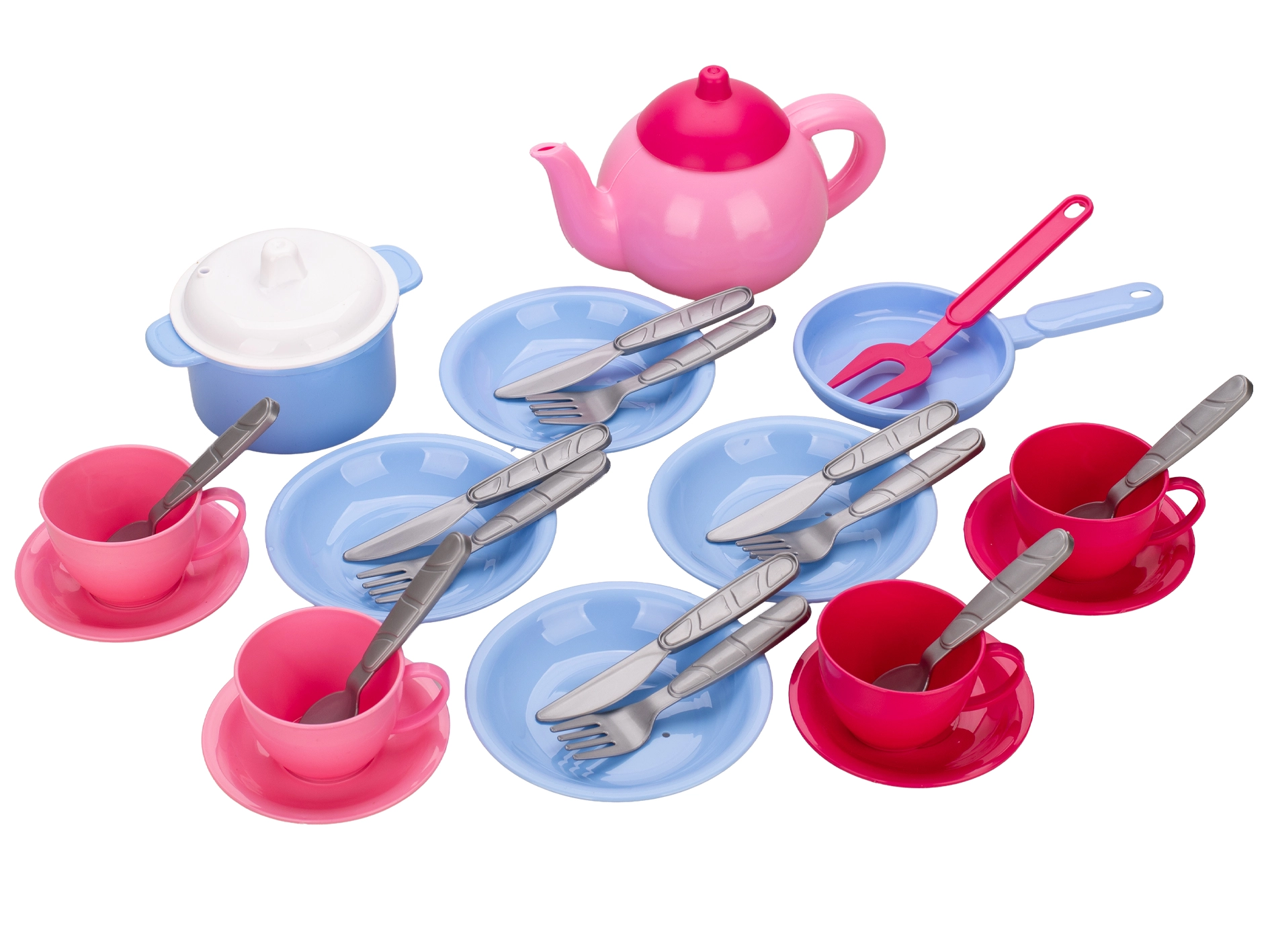 Setul distractiv de veselă pentru bucătăria copiilor, cu 30 de piese colorate, îi va încânta pe micii bucătari și bucătărese. Include ceainic, oală cu capac, tigaie, farfurii, tacâmuri, cești și farfurioare pentru un joc realist de gătit și servire. Plasticul ușor și rezistent este ideal pentru mâinile copiilor și susține imaginația, motricitatea fină și abilitățile sociale. Potrivit pentru copii de la 3 ani.