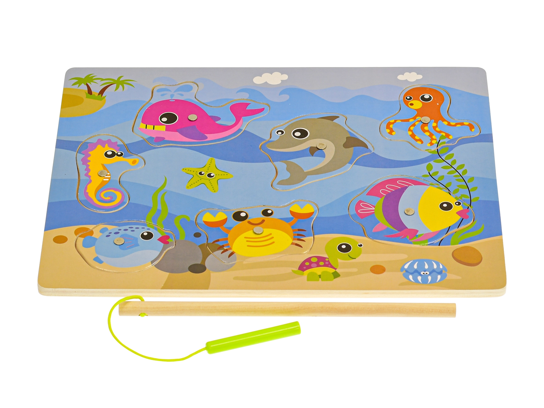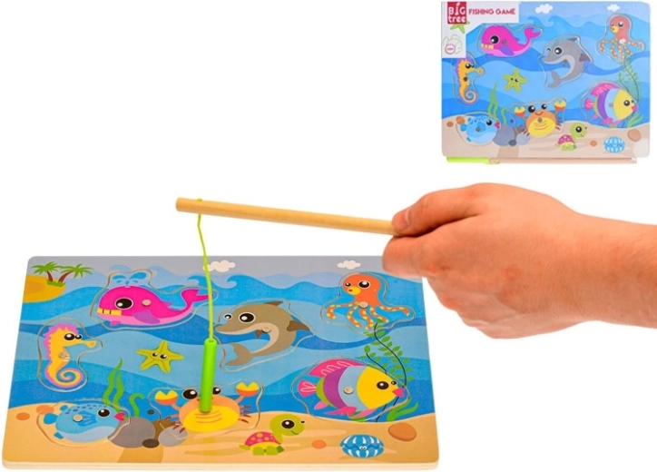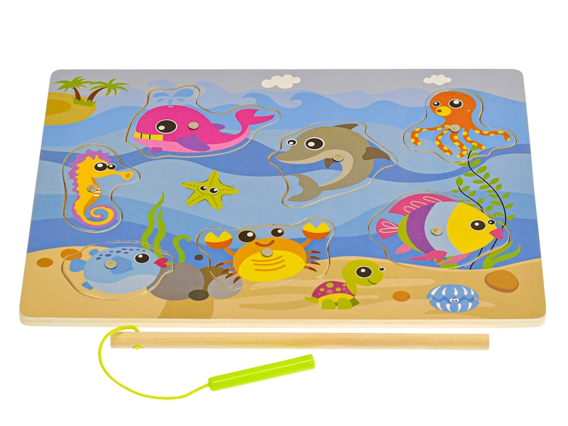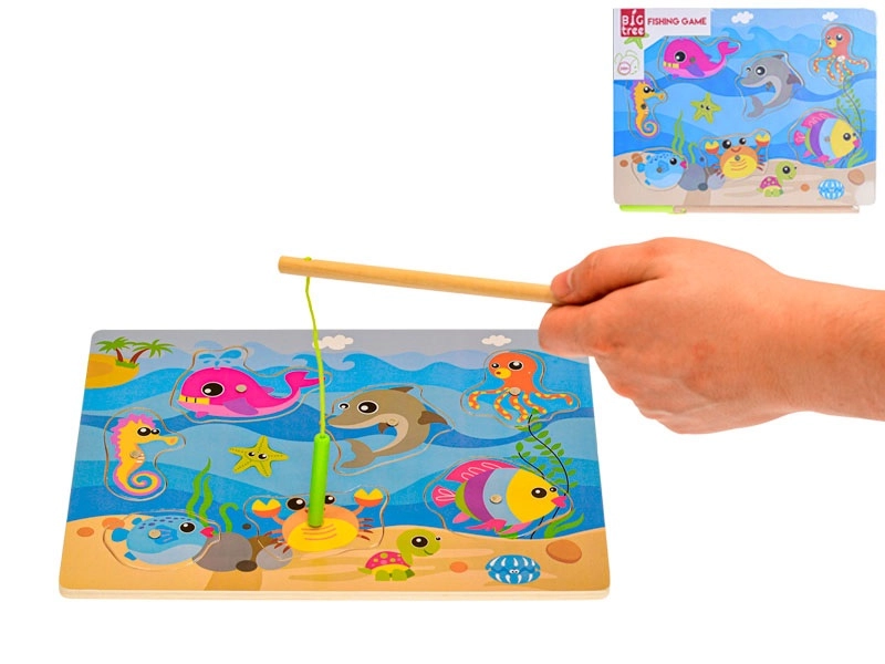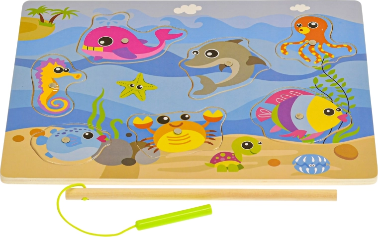 Joc magnetic din lemn, distractiv și educativ, pentru cei mici de la 24 de luni. Datorită undiței magnetice, copiii prind cu ușurință peștișori colorați, dezvoltând astfel motricitatea fină, coordonarea mână–ochi și răbdarea. Tabla de joc servește totodată ca sortator pentru recunoașterea formelor și gândirea logică.