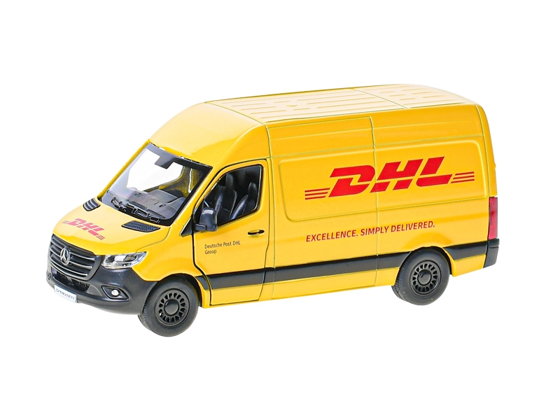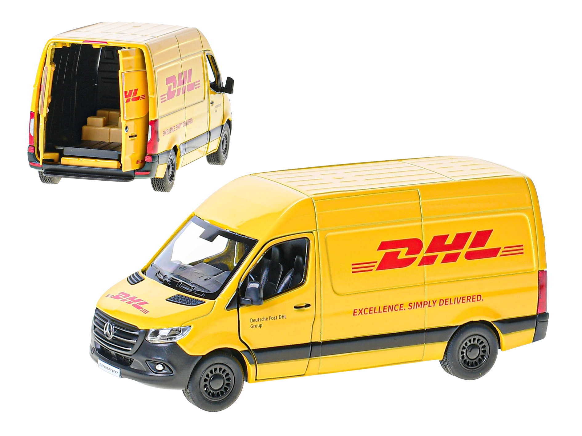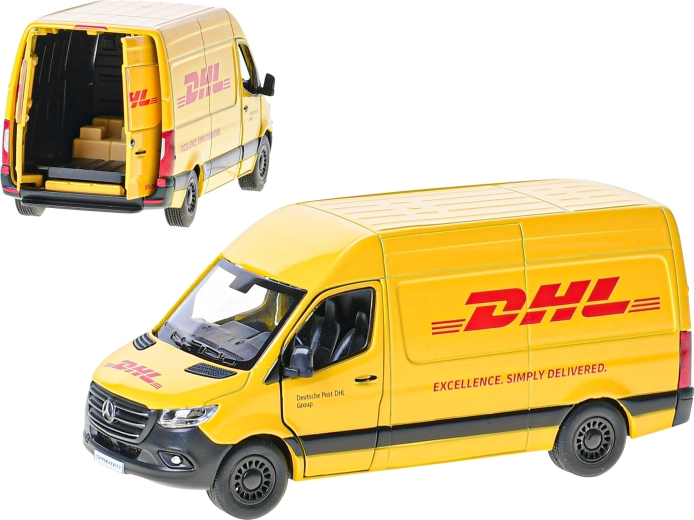 Datorită ușilor laterale și spate deschise puteți arunca ușor o privire în cabină și în spațiul de marfă. Mecanismul pull‑back permite, după armare, o mișcare lină înainte, ceea ce adaugă distracție în timpul jocului. Culoarea autentică galbenă cu logo DHL subliniază caracterul realist al modelului.